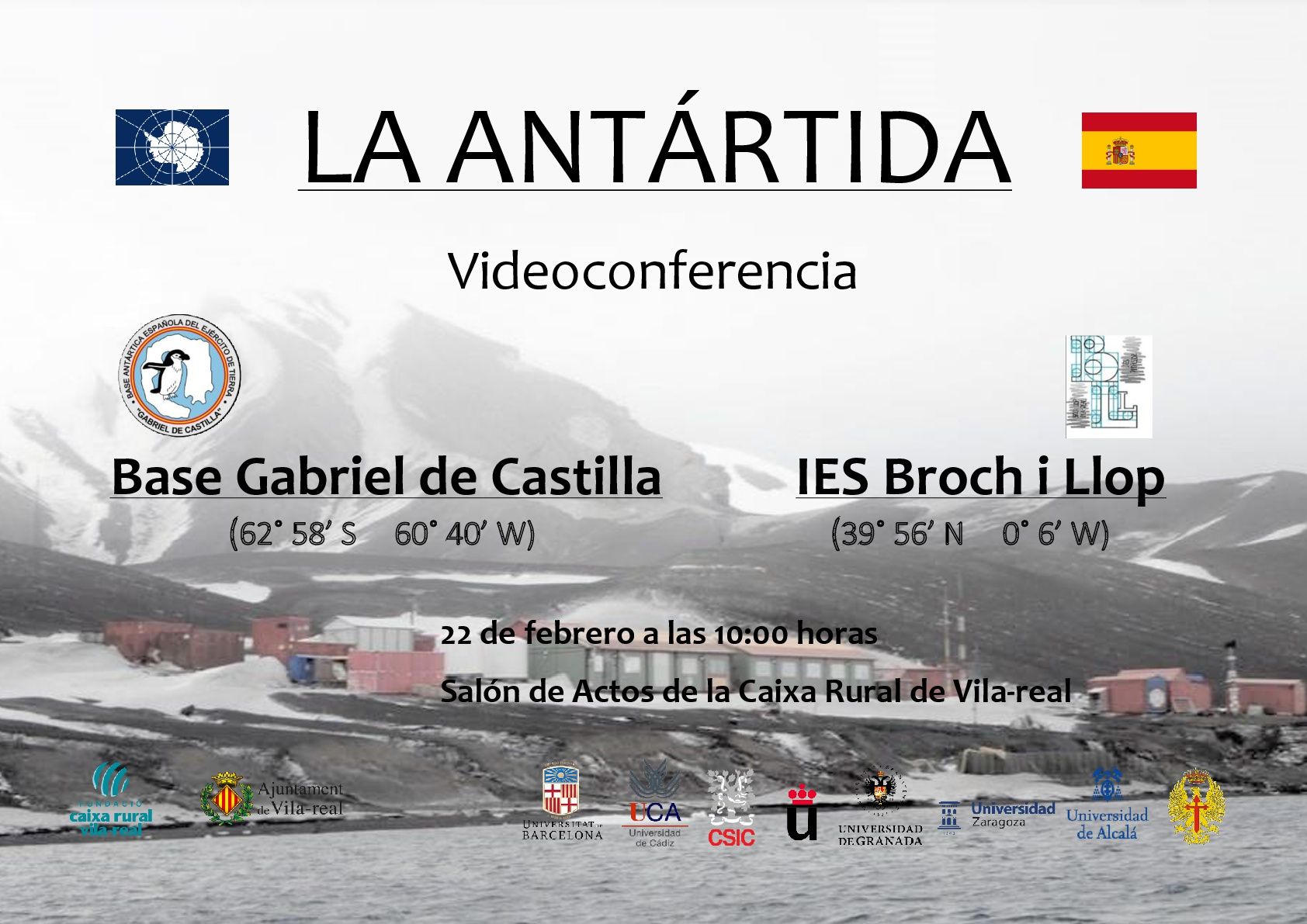 El acto central ha girado en torno a la videoconferencia que ha tenido lugar hoy viernes, día 22 de febrero, a las 10 horas entre los militares y los científicos de la Base Gabriel de Castilla, situada en la Isla Decepción de la Antártida, y los alumnos del IES Broch i Llop de Vila -real. La conexión se ha realizado en el salón de actos de la Caixa Rural.