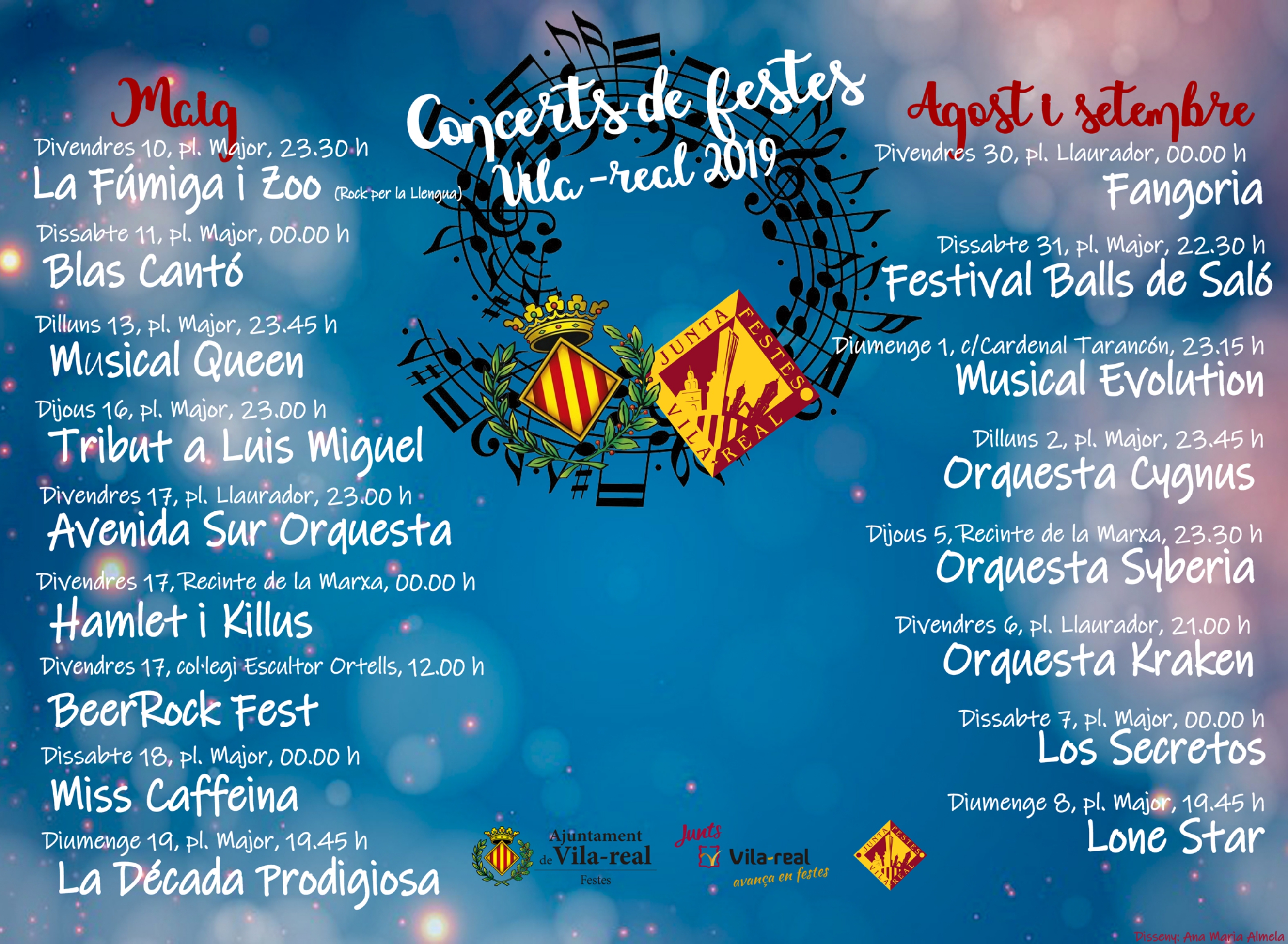 El cartell musical comença el divendres 10 de maig, a les 23.30 hores a la plaça Major, amb el Rock per la Llengua, que organitza la Regidoria de Normalització Lingüística, que ha programat les actuacions de La Fúmiga i Zoo. El mateix escenari acollirà el dissabte 11 l’actuació de Blas Cantó; el dilluns 13 el Musical Queen, i el dijous 16 un Tribut a Luis Miguel . Les festes de maig comptaran també amb Avenira Sur Orquesta, que oferirà el seu espectacle el divendres 17 en la plaça del Llaurador.