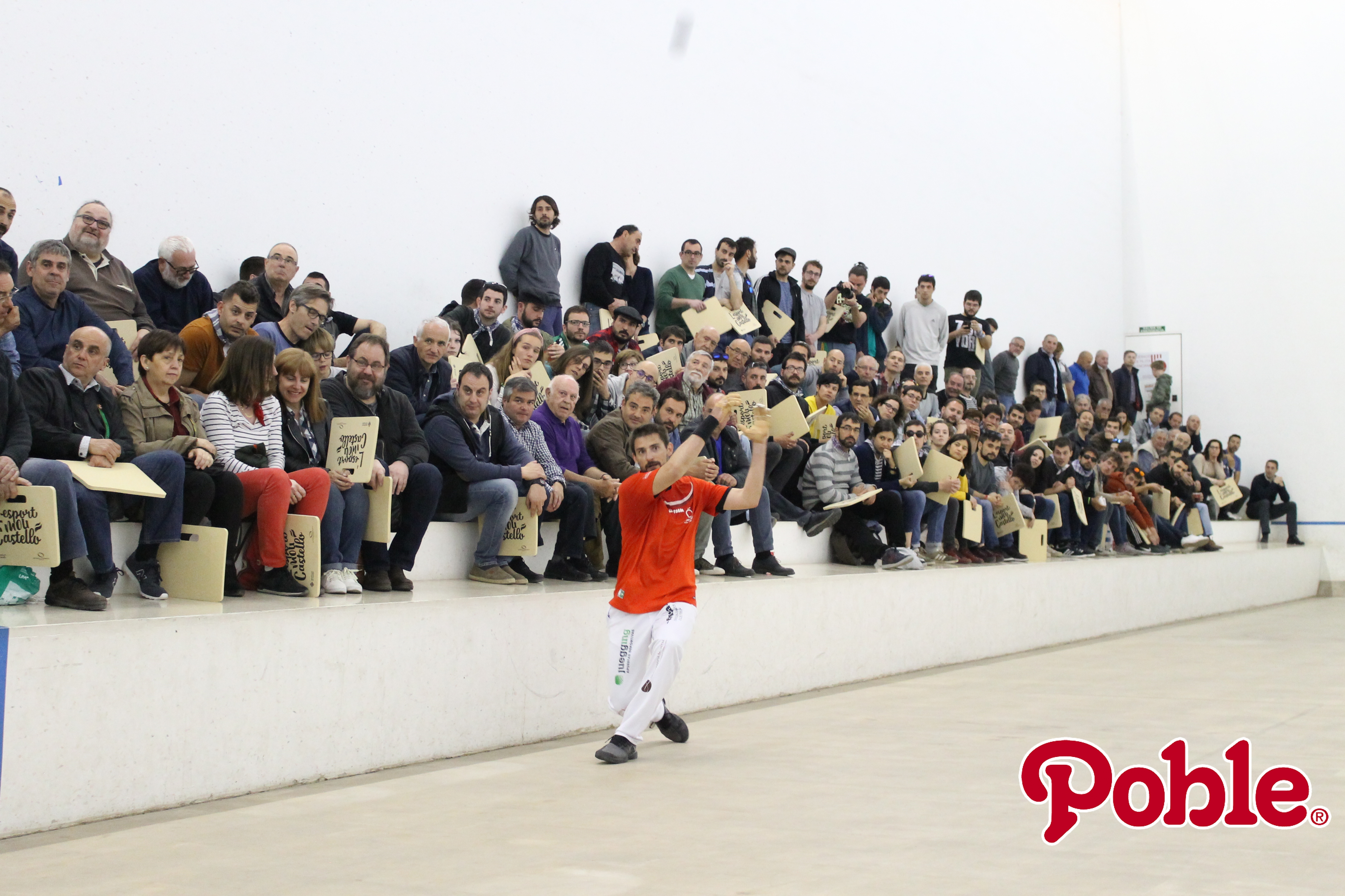 La partida va estar molt igualada i emocionant i no es va decidir fins al final. Els blaus (Genovés II i Javi) van estar a punt de empatar a 55, però Soro III i Héctor es van imposar amb un 60 a 50 final, emportant-se així el premi de 400 euros. El públic assistent va aplaudir intensament els punts més espectaculars, gaudint del joc amb comoditat gràcies als recentment estrenats coixinets que ha aportat el Patronat d’Esports, que serveixen també per a protegir-se de pilotades inoportunes.
