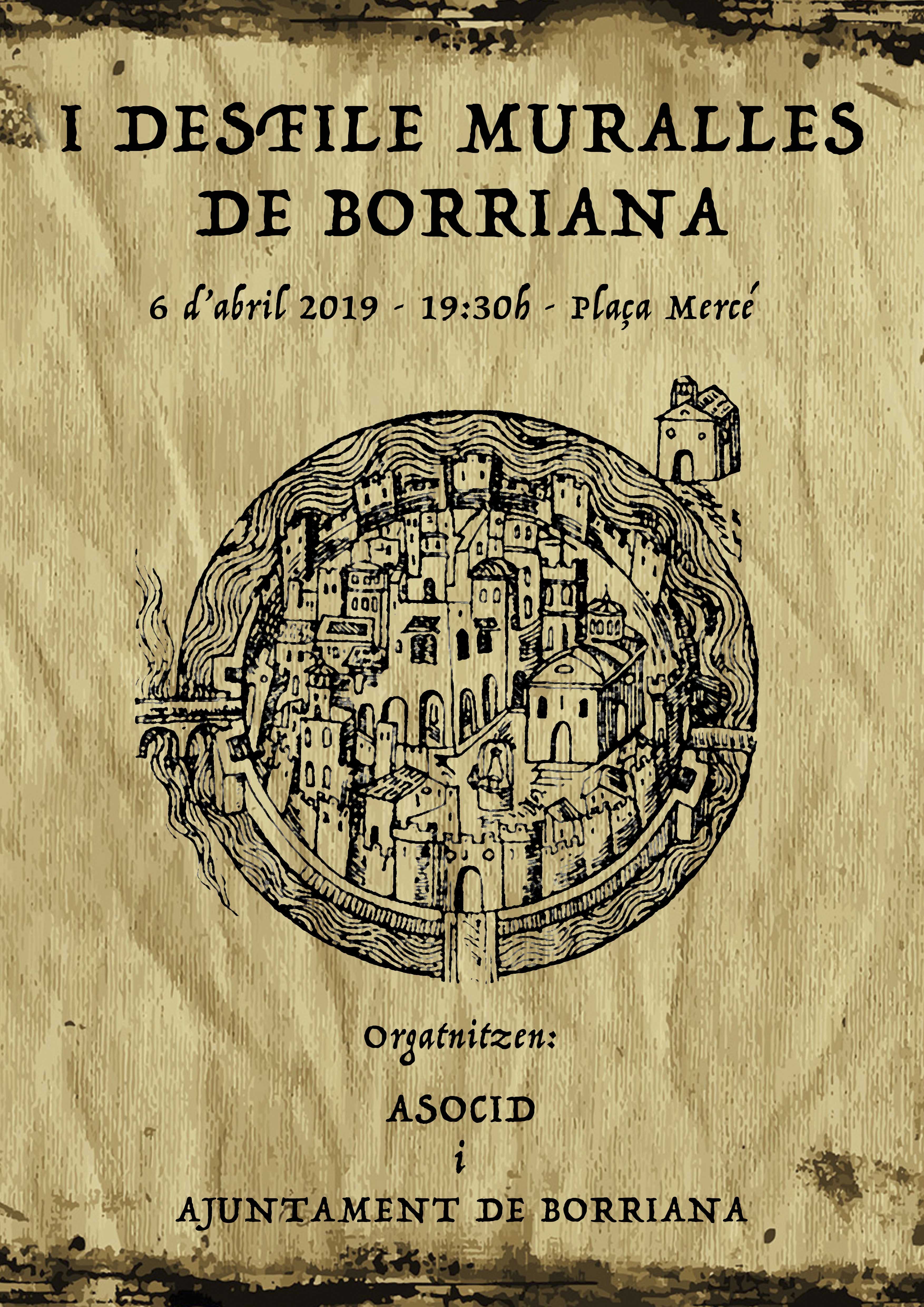 A las 19:30 horas, se realizará el desfile medieval “Muralles de Borriana”, ya que recorrerá la ubicación de las tres puertas principales de la muralla antigua de Borriana. El desfile tendrá inicio en la calle Pere Pasqual, y plaza La Mercé, La Tanda, Plaza Martí de Viciana, Barranquet, Sant Agustí, Purísima, Vicente Forner, Plaza Juan Carlos I, calle Mayor y llegada a la Plaza Mayor, comandado por los Tambores Templarios. Tras las Damas y Caballeros de las diferentes asociaciones participantes, llegarán las banderas de Vivar del Cid y del antiguo Reino de Castilla que antecederán al Cid y a Doña Jimena. Tras ellos, harán acto de presencia el estandarte de la Corona de Aragón que llegará justo antes del Obispo de Albarracín y de los reyes Jaume I y Na Violant de Hungría. A los cinco y las banderas y estandarte se realizarán vítores y cruce de espadas de honor.