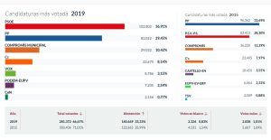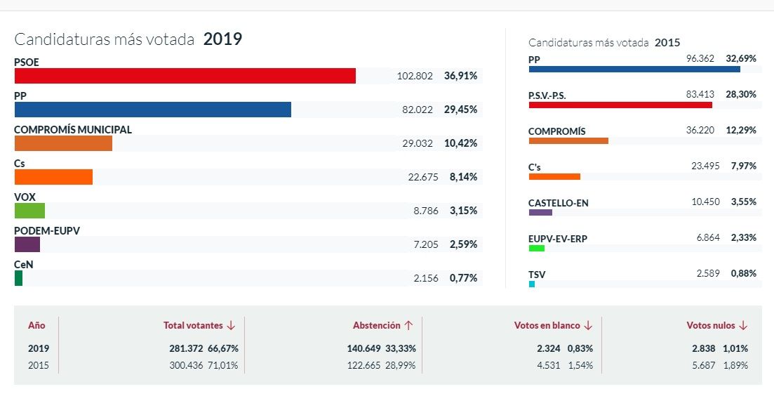 Así pues, la distribución de escaños queda con 12 para los socialistas, 11 para el PP, 2 para Ciudadanos y otros 2 para Compromís.