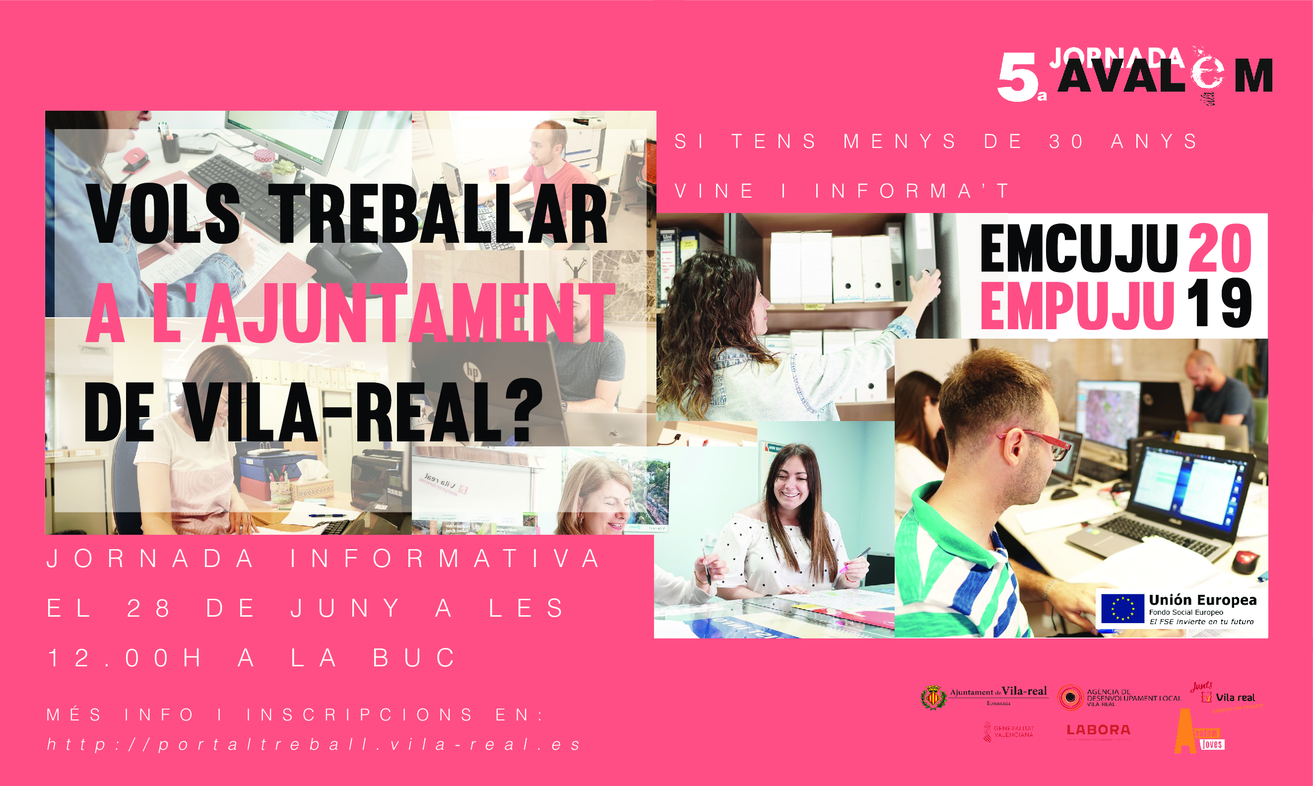 L’Ajuntament de Vila -real, a través de la Regidoria d’Economia, celebrarà el pròxim 28 de juny la cinquena jornada Avalem Joves, que servirà de cloenda als programes d’ocupació que s’han desenvolupat enguany i també per a presentar la nova convocatòria de Avalem, en una sessió informativa oberta a tots els interessats que tindrà lloc a les 12.00 hores a la BUC.