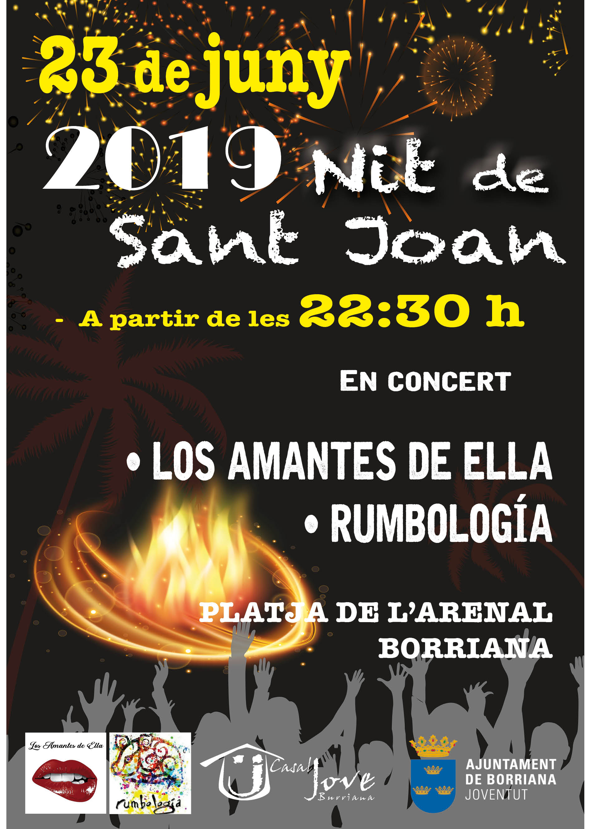 La Nit de Sant Joan sempre es viu de forma especial a Borriana, i especialment durant la nit a les seues platges amb la massiva encesa de fogueres. Perquè l’arribada de la nit més curta del any siga encara més divertida, des de la Regidoria de Joventut s’han organitzat uns concerts de la mà de “Rumbología” que començaran a tocar a partir de les 22.30 hores i “Los Amantes de Ella”, grup que començarà la seua actuació una vegada els i les assistents hagen demanat els seus desitjos en la riba de la platja. Aquesta festa tindrà lloc en una de les vies d’accés a la platja de l’Arenal, situada entre el Restaurant el Pilón i la seu del Club de Surf del municipi.
