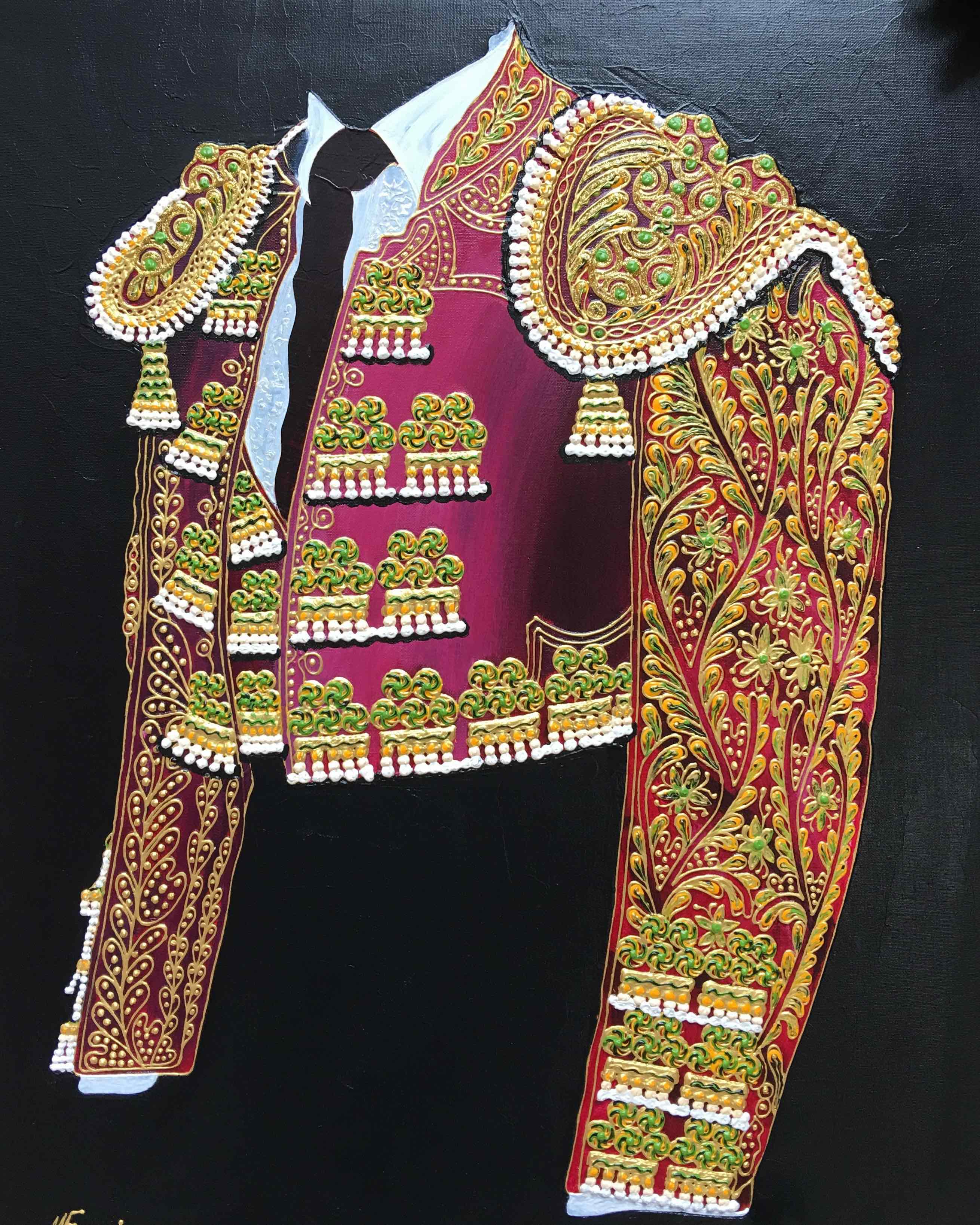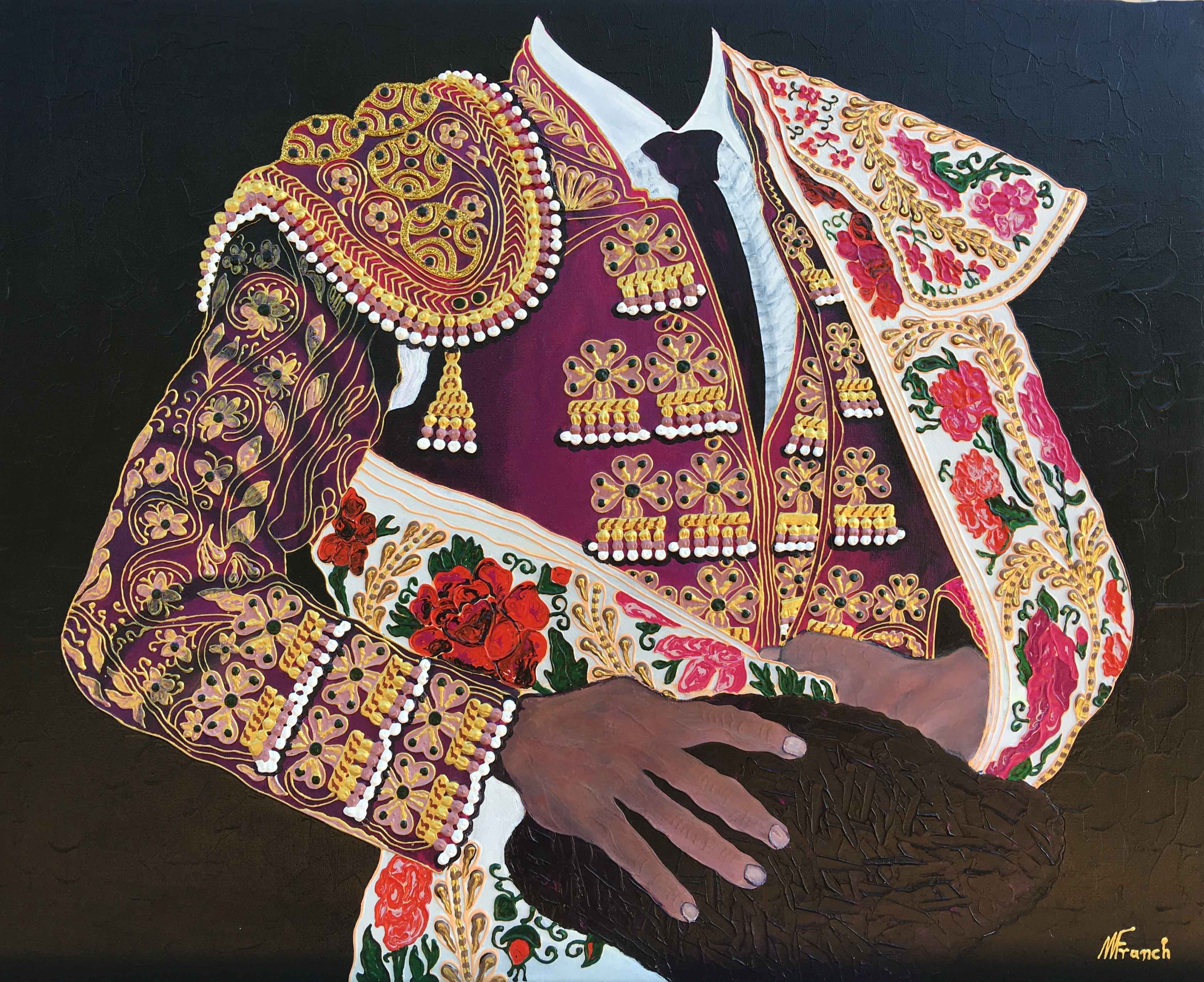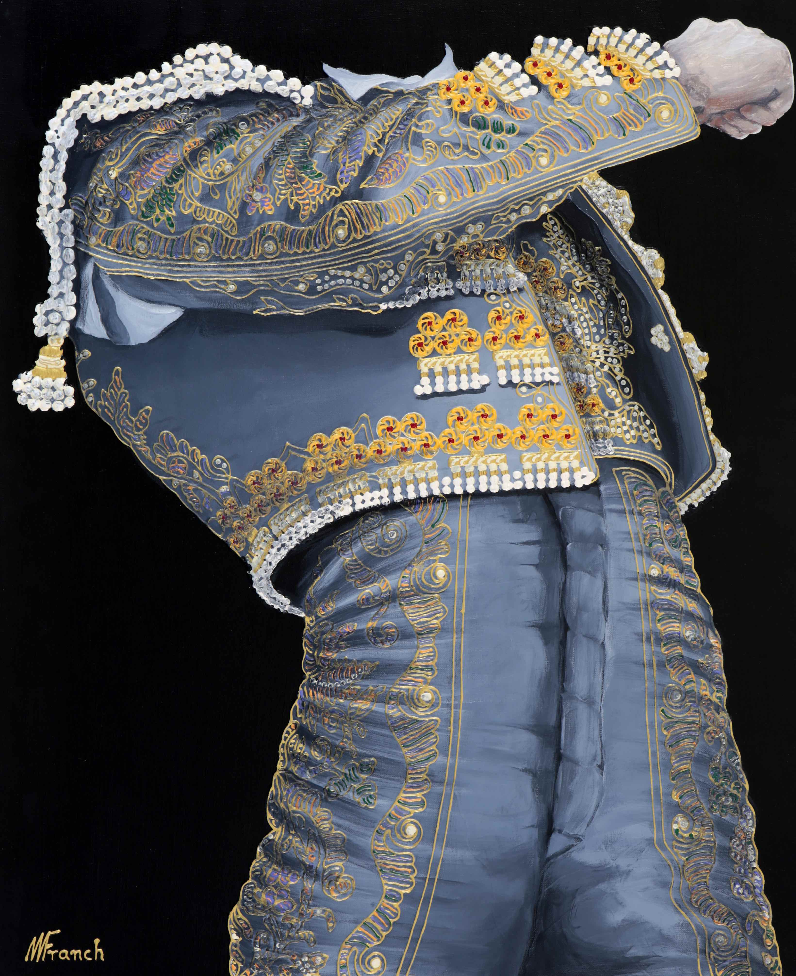 El artista vila-realense prosigue con su particular homenaje al traje del torero que encandila por sus costuras y detalles, sedas y lentejuelas. Una pieza única en el mundo a la que Manuel Franch rinde pleitesía sin aludir jamás al binomio torero-toro. Es la elegancia, el porte y los arabescos los que atrapan al creador, y no la violencia explícita o implícita del arte de la tauromaquia. Los verdes, magentas, azules, grises y oros se recortan sobre fondos opacos, casi siempre negros y en los últimos tiempos rojo bermellón. Manuel Franch se deleita en recrear los bordados y alamares que recorren con hilo de oro o plata chaquetillas, capotes o taleguillas. Como novedad el pintor incorpora una serie de piezas de pequeño formato (50 x 50) que ya han recorrido algunas ferias de España, París y, en breve, Luxemburgo de la mano de la galería madrileña Eka & Moor.