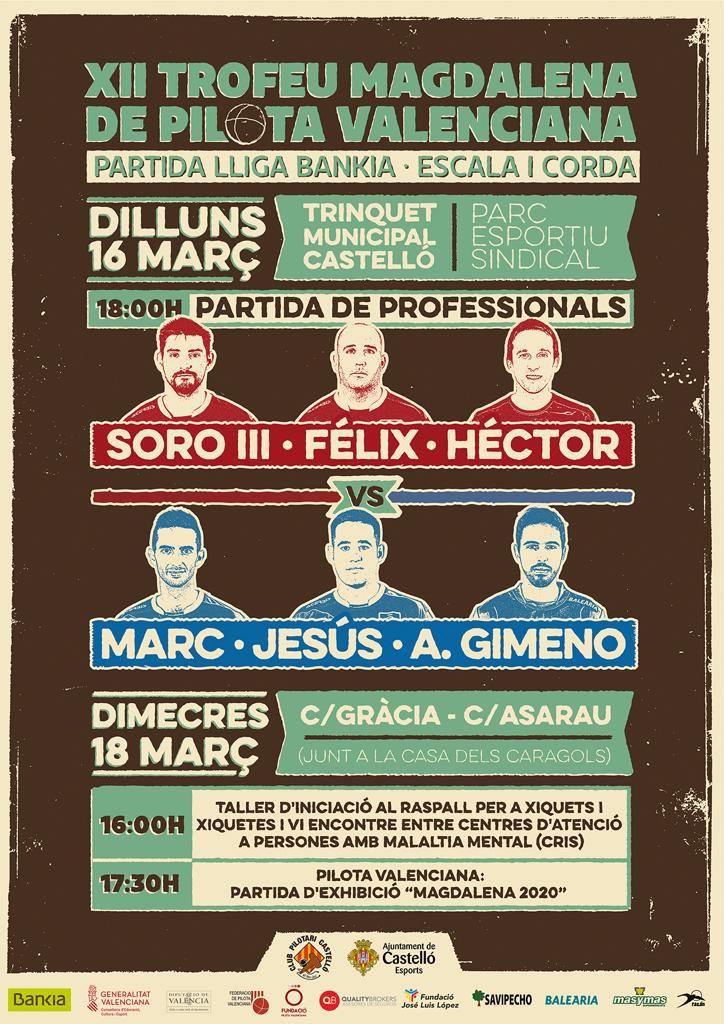 La primera cita del calendari del XII Trofeu Magdalena de Pilota Valenciana tindrà lloc el dilluns 16 de març a les 17.30 hores en el Trinquet Municipal de Castelló amb la partida de la Lliga Bankia que enfrontarà a l’equip de Soro III, Félix i Héctor amb el trio format per Marc , Jesús i A. Gimeno.