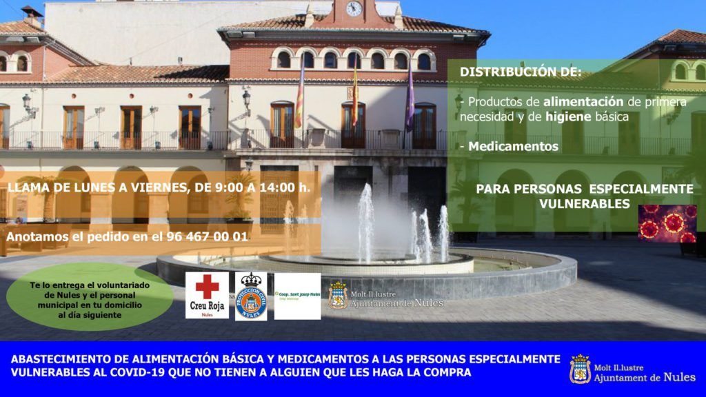 Para dar respuesta a la necesidad creada tras el estado de alarma decretado por el Gobierno de España y ante las recomendaciones sanitarias para que la ciudadanía, especialmente personas vulnerables al COVID-19, no salga de sus casas, el Ayuntamiento de Nules ha activado a los equipos municipales de respuesta básica en emergencias, poniendo en marcha el programa ABASTECIMIENTO DE ALIMENTOS Y MEDICAMENTOS EN CASA.
