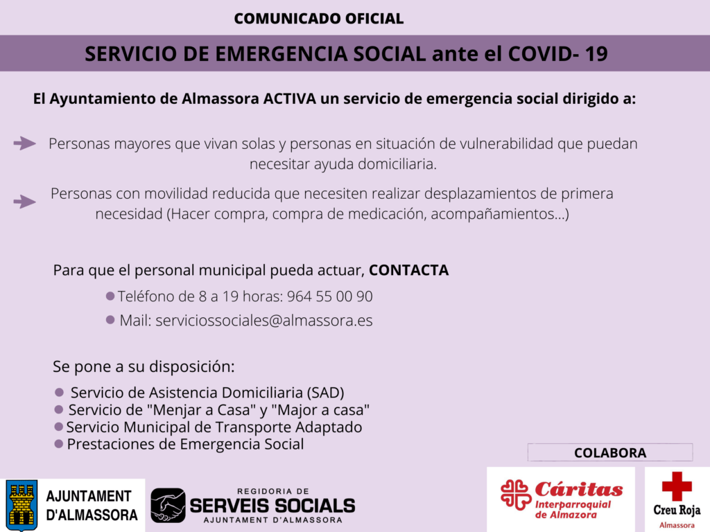 L’Ajuntament d’Almassora ha activat un servei d’emergència per a realitzar compres d’alimentació i fàrmacs a persones majors, discapacitades, amb mobilitat reduïda o en situació de vulnerabilitat durant la pandèmia de coronavirus. Els Serveis Socials municipals inscriuran els beneficiaris d’esta ajuda a través del telèfon 964550090 i el correu electrònic serviciossociales@almassora.es.