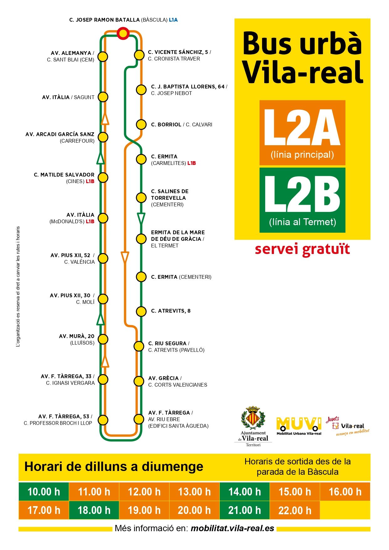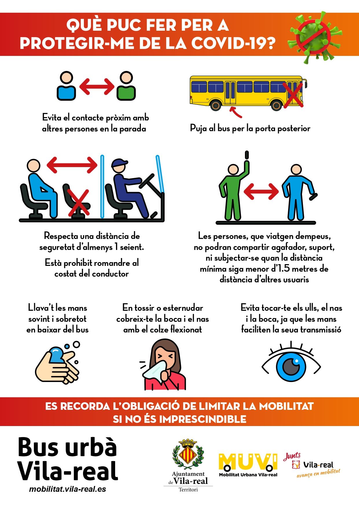 Totes aquestes mesures i altres consells d’ús es desplegaran en cartells informatius que es col·locaran en totes les parades i autobusos. D’aquesta manera, el Groguet -l’únic servei d’autobús urbà gratuït- podrà continuar prestant servei a la ciutadania que no disposa de mitjans propis per a desplaçar-se a aquells llocs i en les circumstàncies permeses en el Reial decret 463/2020 de 14 de març pel qual es declara l’estat d’alarma. El bus urbà de Vila -real anirà adaptant les seues condicions d’ús i trajectes a les condicions imposades per les autoritats competents fins que se supere l’emergència sanitària.