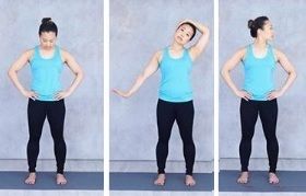Primero trabajaremos el cuello, este ejercicio puede realizarse tanto de pie como sentados… estiramos progresivamente el cuello en todos sus ángulos y siguiendo con la mirada todo el movimiento.