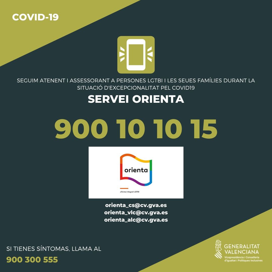En el cas de l’atenció a persones en relació amb temes afectivosexuals LGTBI, es recorda que la Conselleria d’Igualtat i Pol ítiques Inclusives manté en funcionament el servei de l’Oficina Orienta. Es pot contactar a través del 900 101 015 o bé a través del correu electrònic orienta_cas@cv.gva.es.