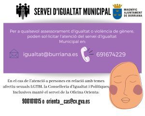 L’Ajuntament de Borriana informa la ciutadania que per a qualsevol assessorament en relació a temes d’igualtat o violència de gènere, poden sol·licitar l’atenció del servei d’Igualtat Municipal a través del correu igualtat@burriana.es, o el telèfon 691674229. També, per a revisió de Plans d’Igualtat i atenció a la ciutadania a la qual només s’atendrà amb cita prèvia.