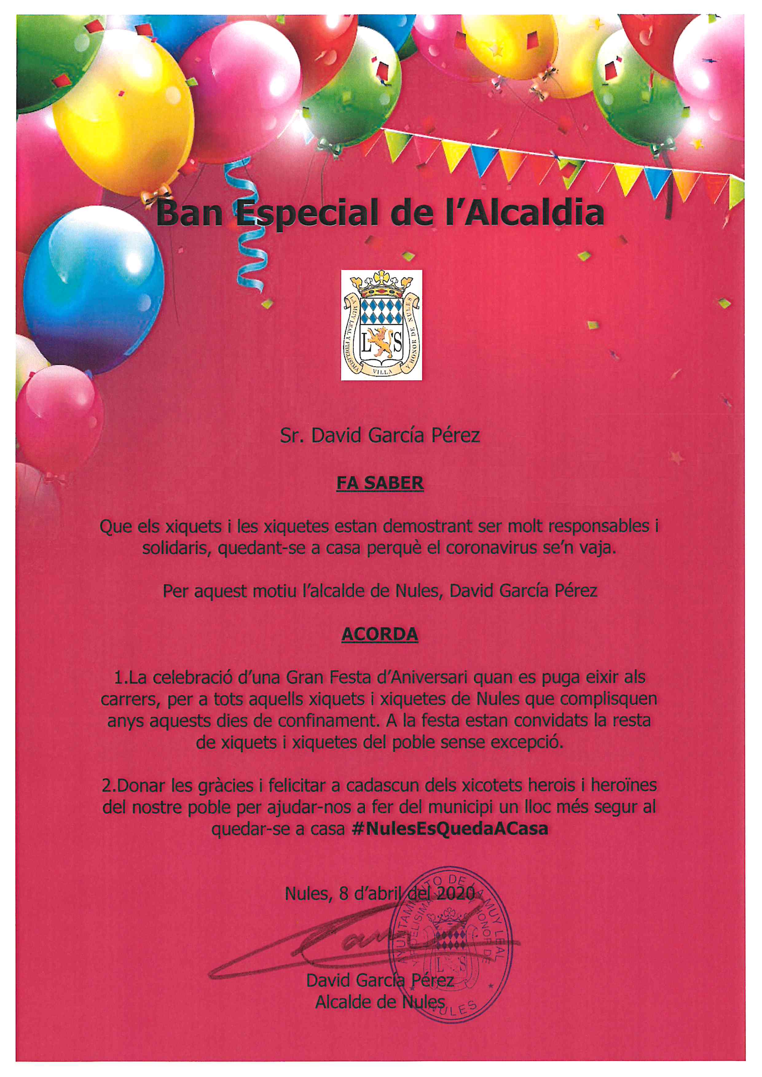 “És una festa oberta a tots els xiquets i xiquetes que tindrà lloc una vegada finalitze l’estat d’alarma i s’haja superat la pandèmia, per tant encara no es pot concretar la data. De fet, amb aquest ban ens comprometem públicament a que aquest esdeveniment siga una realitat, al mateix temps que volem fer un reconeixement públic al comportament exemplar dels xiquets i xiquetes de Nules davant el confinament”, explica García .