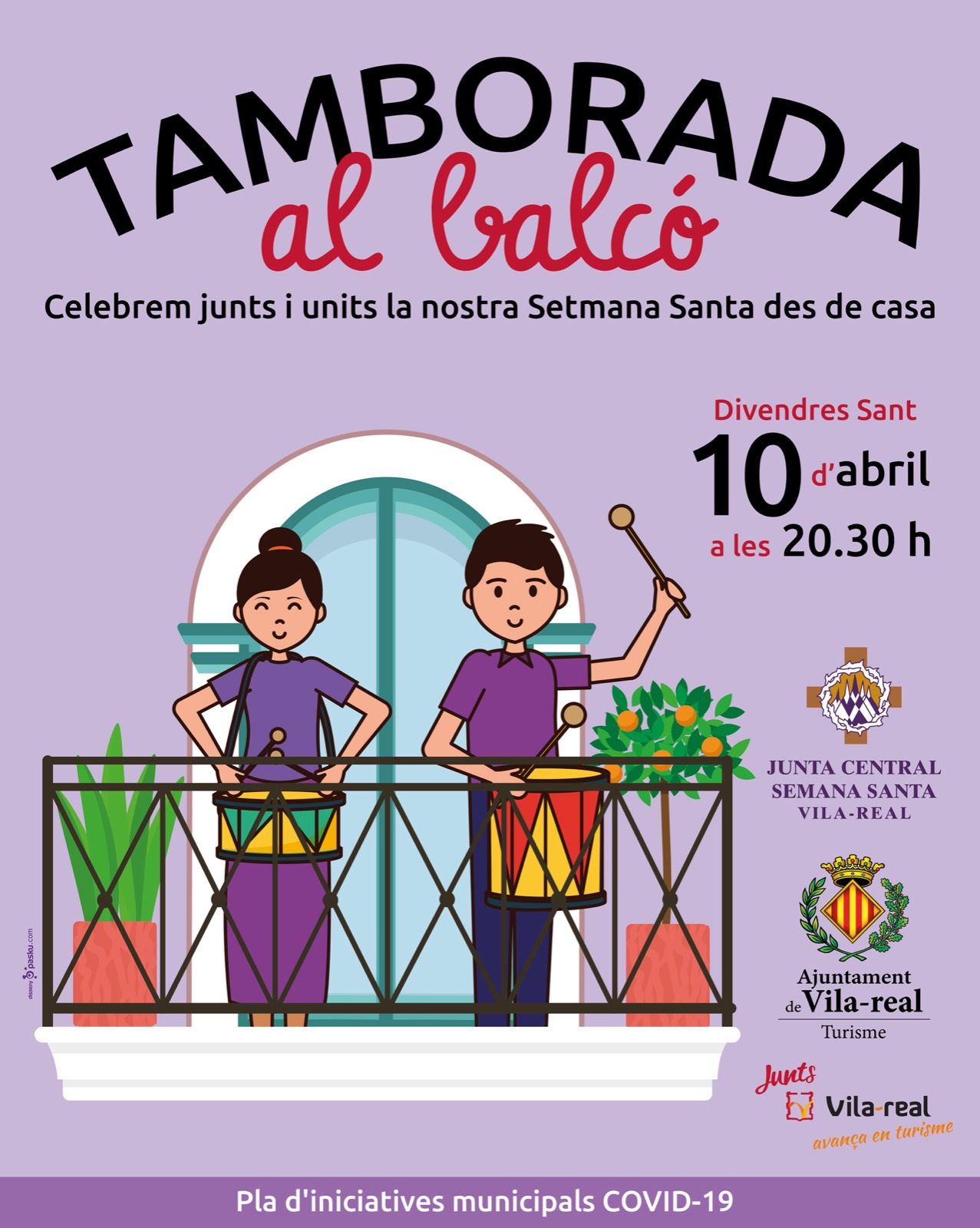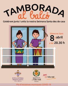 L’Ajuntament de Vila -real, a través de la Regidoria de Turisme, i la Junta Central de Setmana Santa han convocat dues noves tamborades als balcons per a celebrar la Setmana Santa local des de casa després de la bona acollida de la iniciativa del passat Diumenge de Rams. Després que el so dels bombos i tambors ressonara diumenge passat per tota la ciutat gràcies a la participació de membres de confraries, germanors i agrupacions, a més d’altres afeccionats, que van tocar des dels balcons, terrasses i finestres de les seues cases, s’han programat dues noves ‘tamborades al balcó’ aquest dimecres 8 d’abril i divendres 10 d’abril.