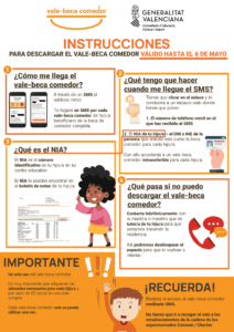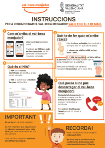 Educació de la Generalitat enviarà aquest dijous, 23 d’abril, per via SMS el segon val-beca menjador quinzenal als telèfons mòbils de les famílies de vora 59.000 alumnes beneficiaris. Les famílies tindran fins al 6 de maig per a bescanviar-lo i, amb això, s’assegura que tot l’alumnat que compta amb el 100 % de la beca menjador per motius de renda, per estar escolaritzat en col·legis d’educació especial o per ser víctima de violència de gènere, reba el val per a adquirir aliments bàsics en la cadena de supermercats de la cooperativa valenciana Consum.