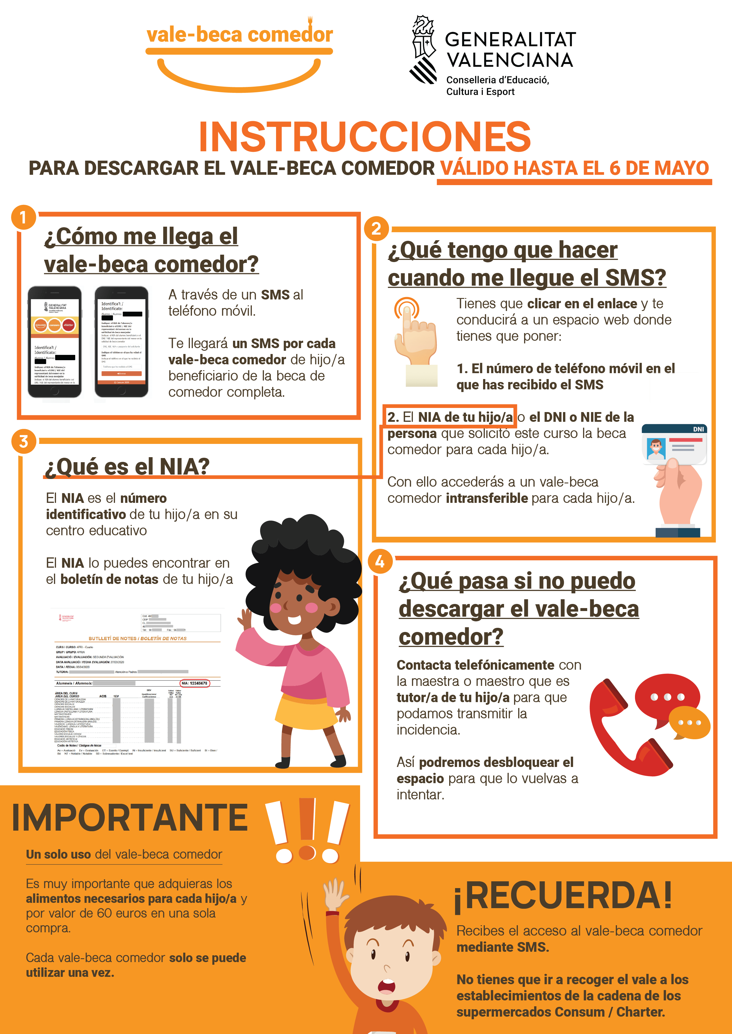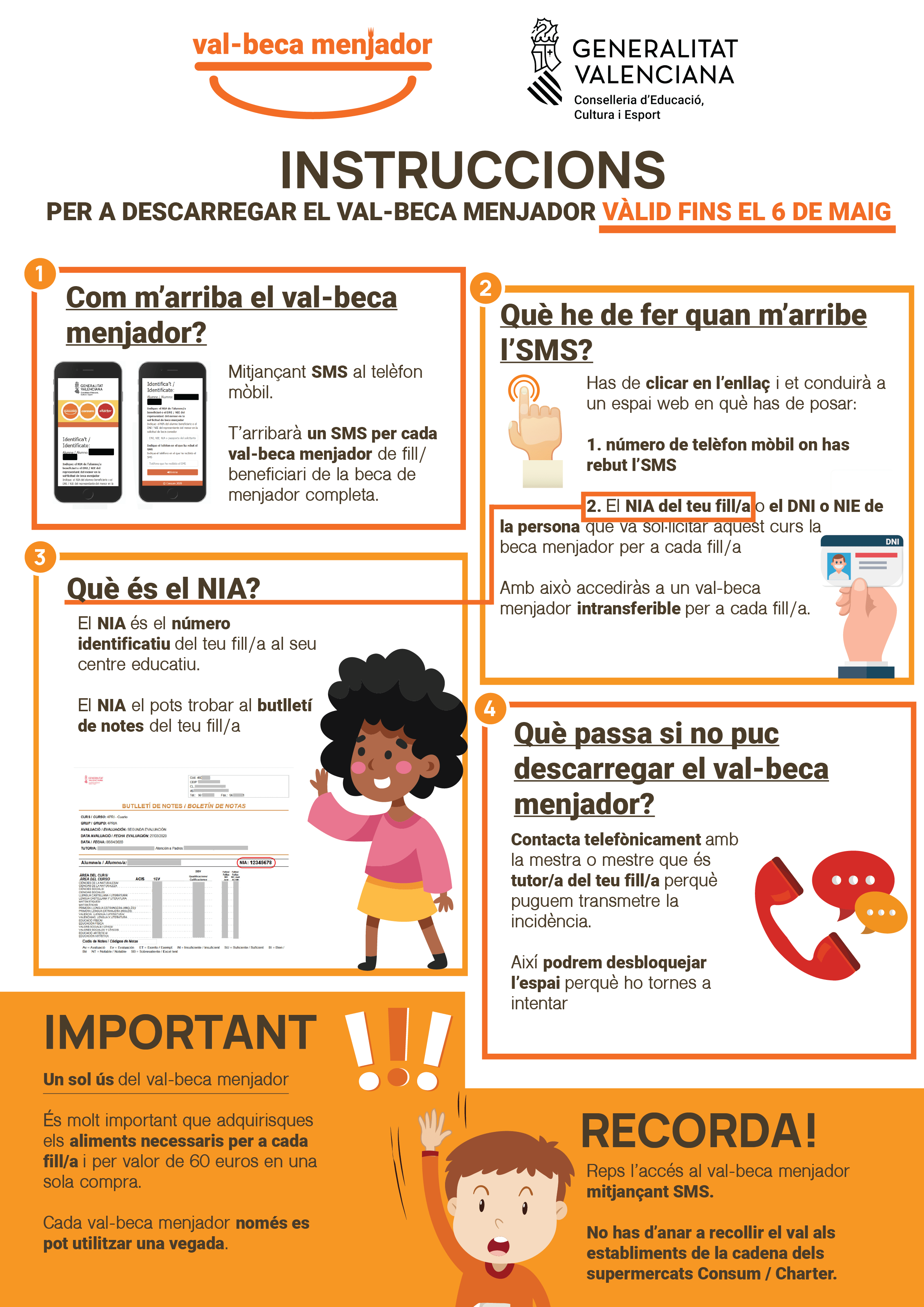 Cada val-beca menjador només es pot utilitzar una vegada. És molt important que les famílies adquirisquen els aliments necessaris per a cada fill/a i per valor de 60 euros en una sola compra.