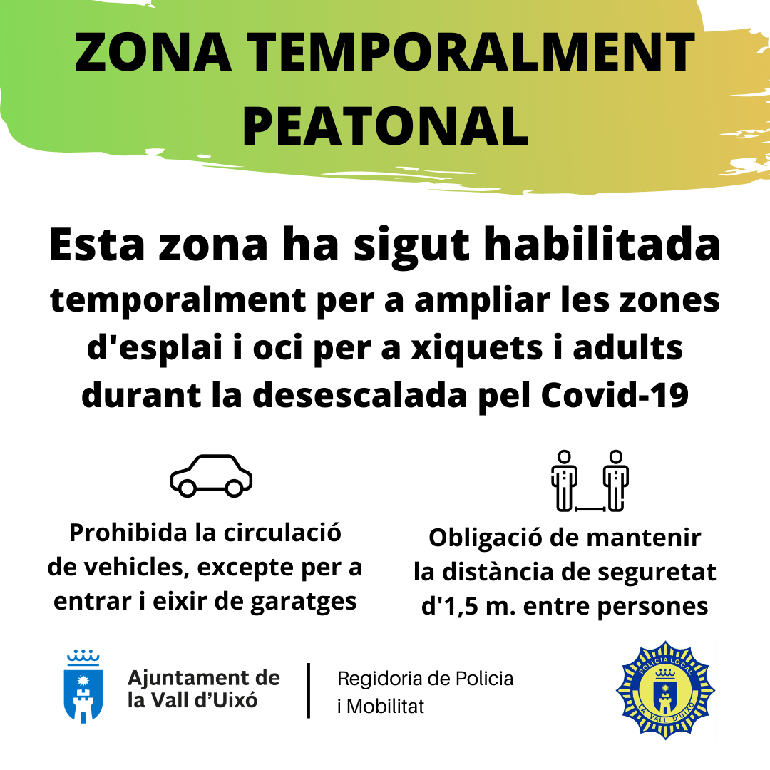 El Ayuntamiento de la Vall d’Uixó pondrá en marcha mañana, viernes 1 de mayo, su proyecto de zonas temporalmente peatonales. El concejal de Policía y Movilidad, Javier Ferreres, ha explicado en qué consiste: espacios públicos habilitados de manera temporal para “ampliar las zonas de esparcimiento para niños y adultos durante la desescalada del Covid-19, de manera que se puedan garantizar “las medidas sanitarias de prevención y seguridad”.