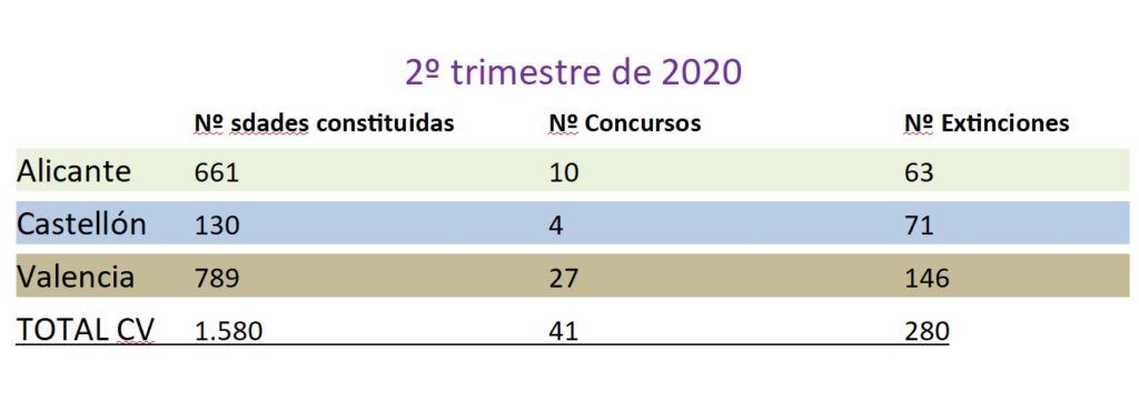 En el conjunto del territorio español se han producido un total de 385 concursos, lo que supone una caída del 59’3% frente al segundo trimestre de 2019. De los 41 concursos contabilizados en la Comunitat, 27 corresponden a Valencia, 10 a Alicante y 4 a Castellón.