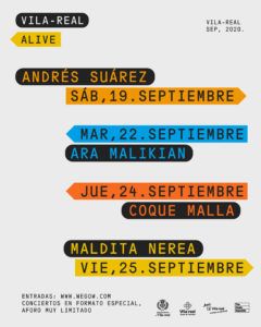 L’Ajuntament de Vila -real presenta el cicle de concerts Vila -real Alive amb quatre actuacions musicals de diferents estils i amb artistes de projecció nacional i internacional com a part del Pla de renaixement impulsat per l’equip de govern per a reactivar la ciutat tant culturalment com econòmica. Els concerts, que es desenvoluparan del 19 al 25 de setembre, comptaran amb els artistes Andrés Suárez , Ara Malikian, Coque Malla i Maldita Nerea, els qui actuaran en el recinte del col·legi Verge del Carmen , un espai delimitat i a l’aire lliure, i amb les corresponents mesures de prevenció per la pandèmia.