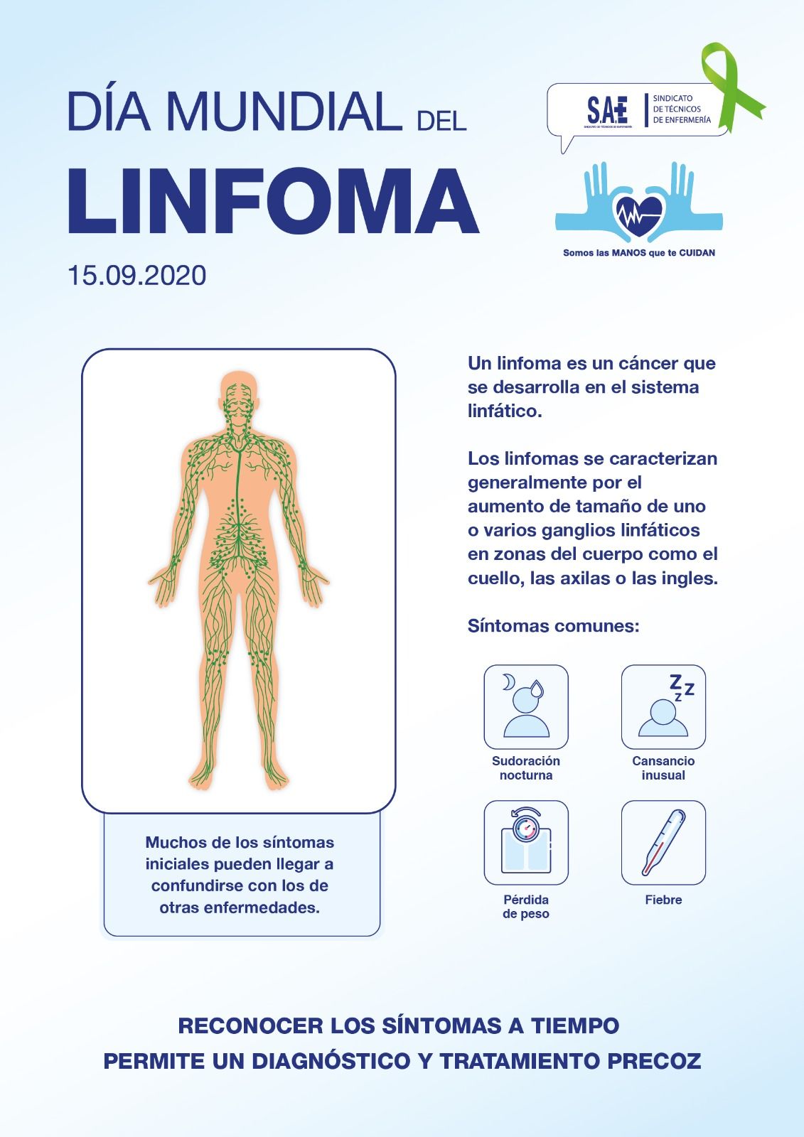 Estas elevadas cifras se deben a la falta de conocimiento por parte de la población para detectar los síntomas de alarma y, por ello, desde el Sindicato de Técnicos de Enfermería (SAE) nos hemos querido sumar al Día Mundial del Linfoma con la distribución de un cartel informativo en todos los hospitales y centros de salud españoles en el que recordamos a la población los principales signos de este tumor, concienciándola sobre la urgencia de acudir al especialista ante cualquier sospecha.