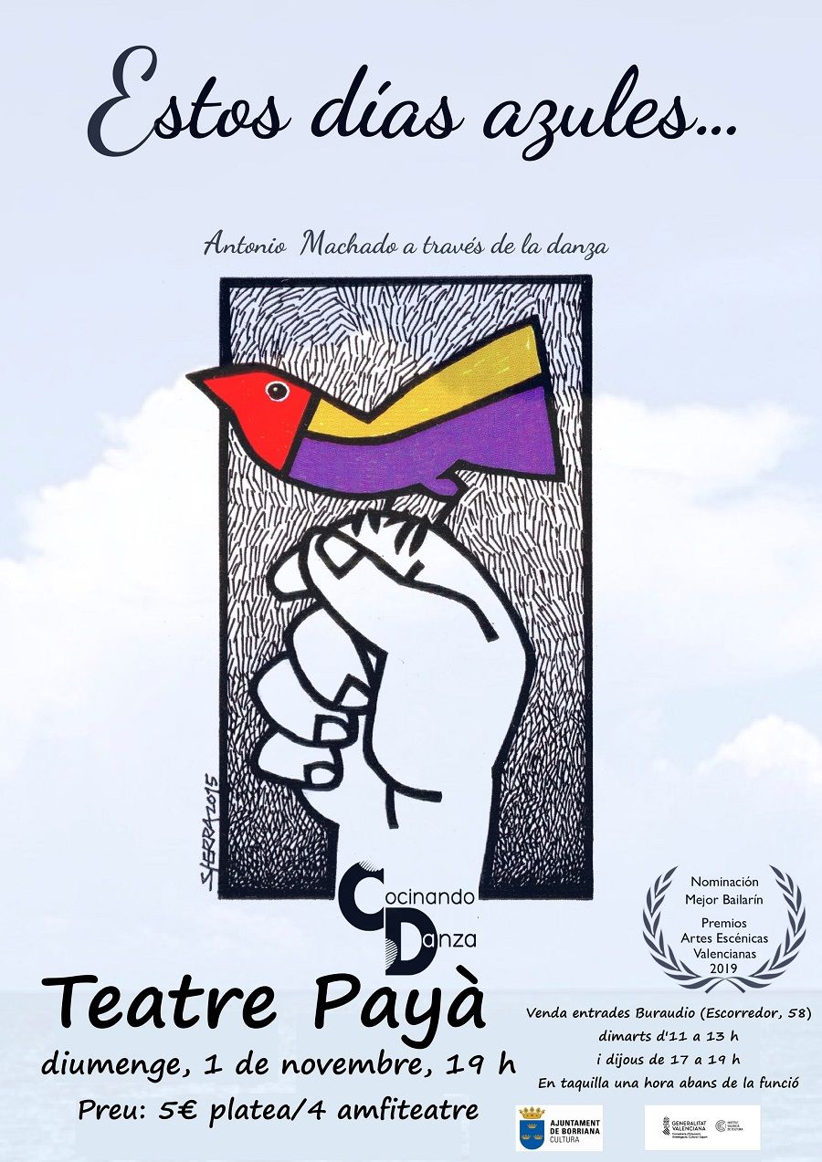 L’Ajuntament de Borriana a través de la regidoria de Cultura, i amb la col·laboració de l’Institut Valencià de Cultura i la participació de Reclam 2020, ha programat l’espectacle interactiu de dansa Estos días azules…, una aproximació a Antonio Machado a través de la dansa, amb Henar Fuentetaja i Miguel Tornero de CocinandoDanza, adaptat a les mesures sanitàries vigents.