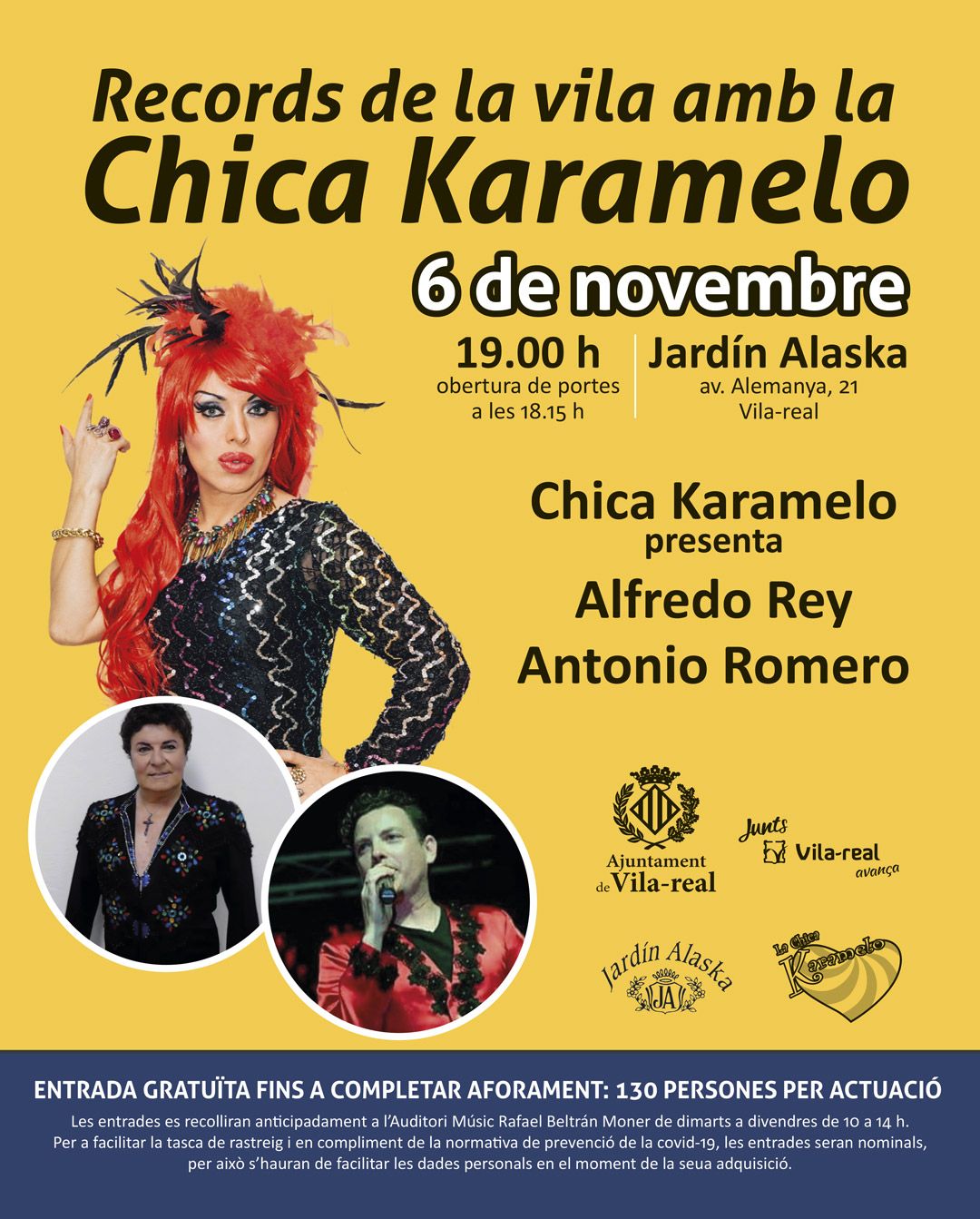 L’Ajuntament de Vila -real ha arribat a un acord amb la Chica Karamelo i el restaurant Jardí Alaska per a llançar un programa pilot d’animació, amb varietés i espectacle, dirigit a un públic adult que, amb motiu de la COVID-19 i el tancament de centres socials i sales de ball, ha vist reduïdes les seues possibilitats d’oci. Al mateix temps, el programa, amb el títol “Records de la vila amb la Chica Karamelo”, persegueix dinamitzar el sector i facilitar l’organització d’activitats culturals, fent costat a l’empresa local i amb totes les mesures de seguretat.