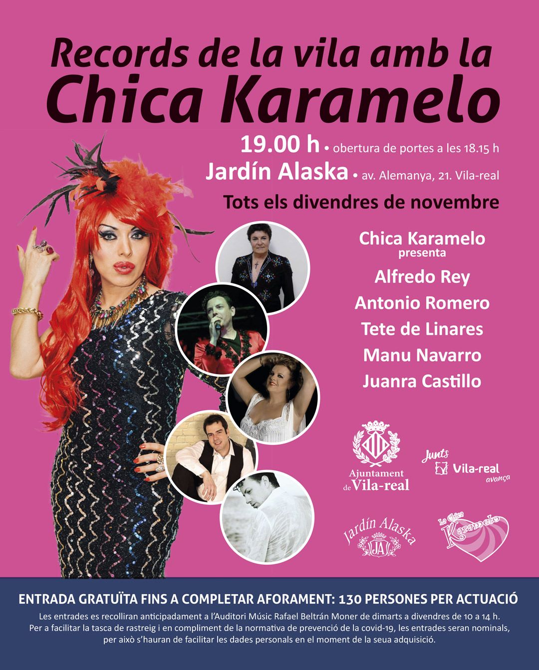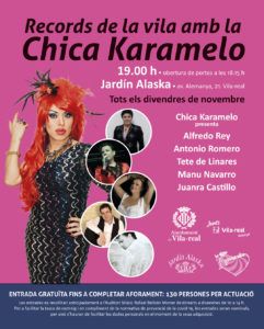 El programa arranca aquest mateix divendres, 6 de novembre, amb la presentació d’Alfredo Rey i Antonio Romero , que s’uniran a la Chica Karamelo en la primera sessió de “Records de la vila”. L’espectacle està previst que s’inicie a les 19.00 hores -obertura de portes a les 18.15 hores- amb aforament limitat a 130 persones. Els interessats poden recollir les entrades a l’Auditori Municipal Músic Rafael Beltrán Moner, fins al mateix divendres, en horari de 10.00 a 14.00 hores. Tete de Linares, Manu Navarro i Juanra Castillo se sumaran a l’elenc d’actuacions de la Chica Karamelo en les sessions successives, durant tots els divendres del mes de novembre.