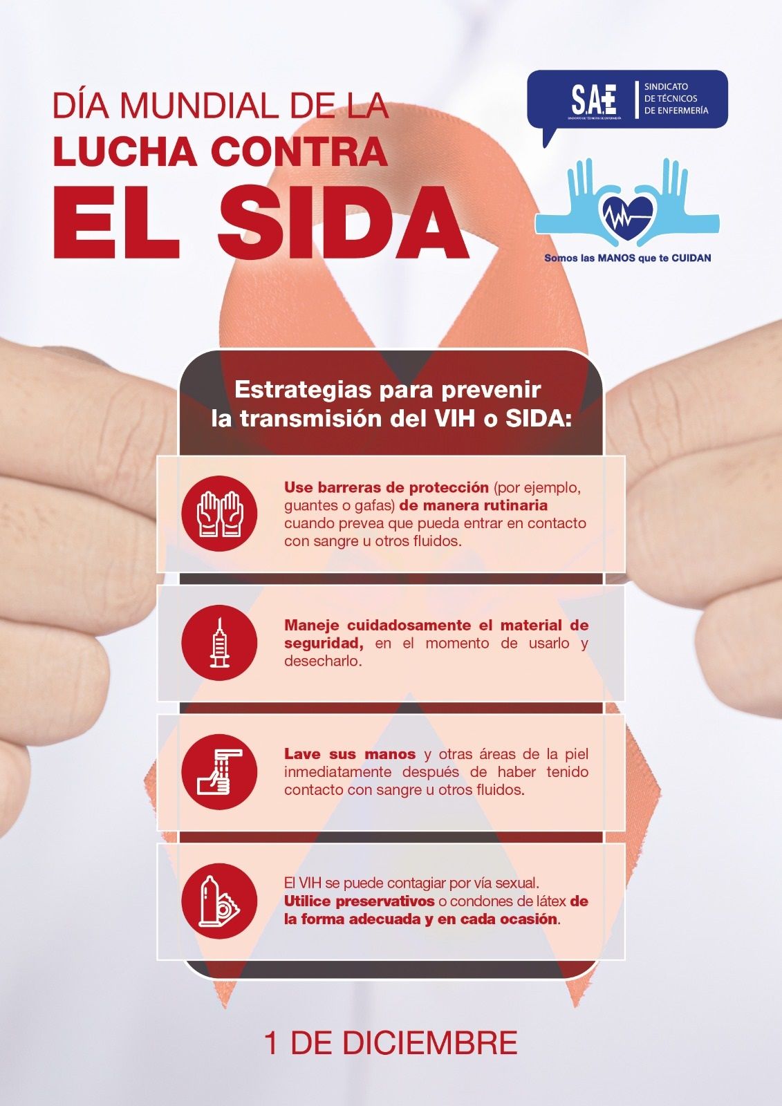 El Sindicato de Técnicos de Enfermería (SAE) se suma al Día Mundial de la lucha contra el Sida con un cartel educativo que recoge las estrategias para prevenir la transmisión del VIH/SIDA en el ámbito sanitario