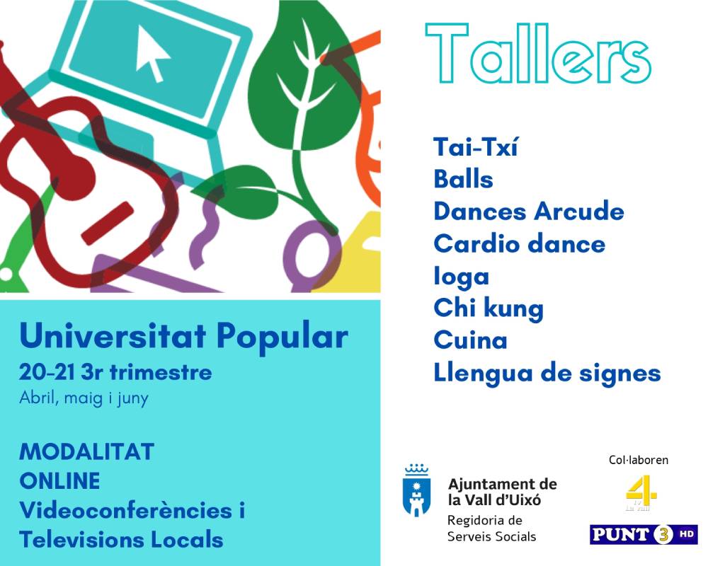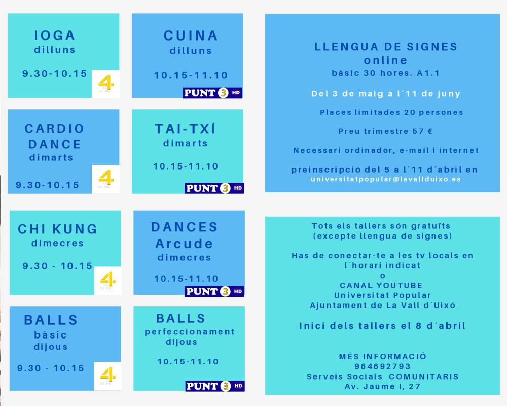 Por otra parte, Artero ha informado que este semestre también se ofrece el curso de lengua de signos de 30 horas y que es convalidable por una certificación oficial del nivel A1.1. Para participar en este curso es necesario preinscribirse del 5 al 11 de abril en el correo electrónico universitatpopular@lavallduixo.es o en el teléfono 964 69 27 93. El precio del curso es de 57 € y es necesario disponer de ordenador e internet.