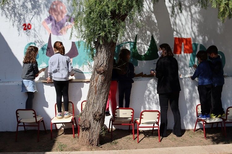 El mural sobre les tradicions locals que embellirà la paret del pati d’infantil del col·legi Pius XII ha començat a prendre forma de la mà de les il·lustradores locals Laulauenlaseuatinta i els alumnes del centre que van demanar a l’alcalde, José Benlloch, a través d’una carta, la creació d’aquest mural.