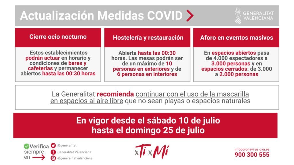 La Generalitat Valenciana ha decidido adoptar nuevas medidas ante el incremento de casos de Covid-19 en la Comunitat. Las medidas se resumen en los siguientes puntos: