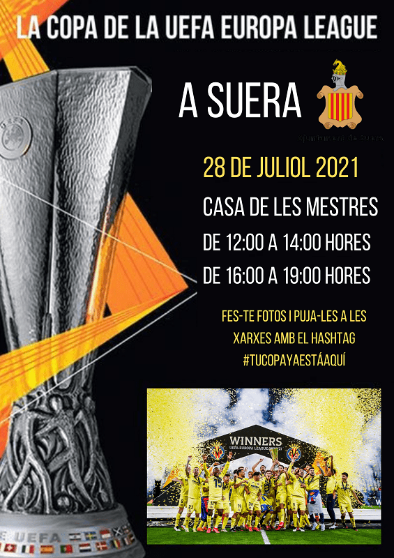 La visita de la Copa de la Europa League, aconseguida pel Villarreal CF el passat 26 de maig a la ciutat de Gdanks, és una de les seues parades en la gira que recorre tota la província per apropar el triomf groguet a l’afició. L’alcalde de Suera, José Martí, declara «estar molt content de que el nostre municipi puga rebre la copa».