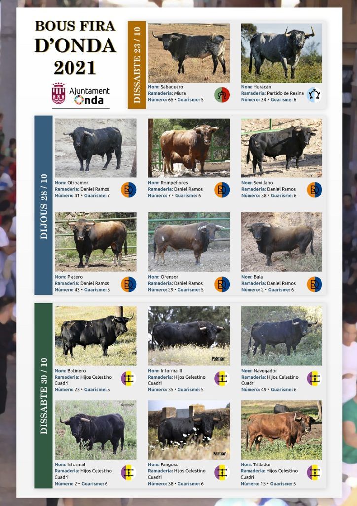 Los hierros seleccionados no necesitan presentación, ya que han escrito parte de la historia del toro bravo, como son Miura y Partido de Resina, para los toros de Fira, e Hijos de Celestino Cuadri y la ganadería castellonense Daniel Ramos para los dos encierros de toros cerriles. Además, el astado de corro volverá a correr a cargo de Germán Vidal .