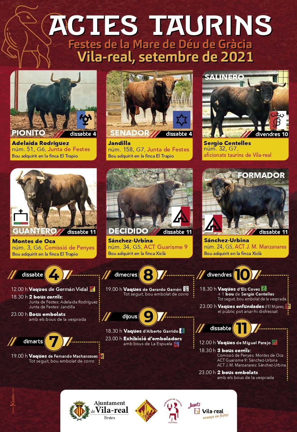 Els actes taurins comptaran amb bous i vaques de les ramaderies Adelaida Rodríguez , Jandilla, Sergio Centelles, Montes de Oca, Sánchez -Urbina, Germán Vidal , Fernando Machancoses, Gerardo Gamón, Alberto Garrido, Miguel Parejo, La Espuela i el Millars. Vila ha recalcat que s’ha donat preferència a les ramaderies de la província de Castelló, per a “continuar ajudant a aquest sector que ha sigut un dels més afectats per la pandèmia”.