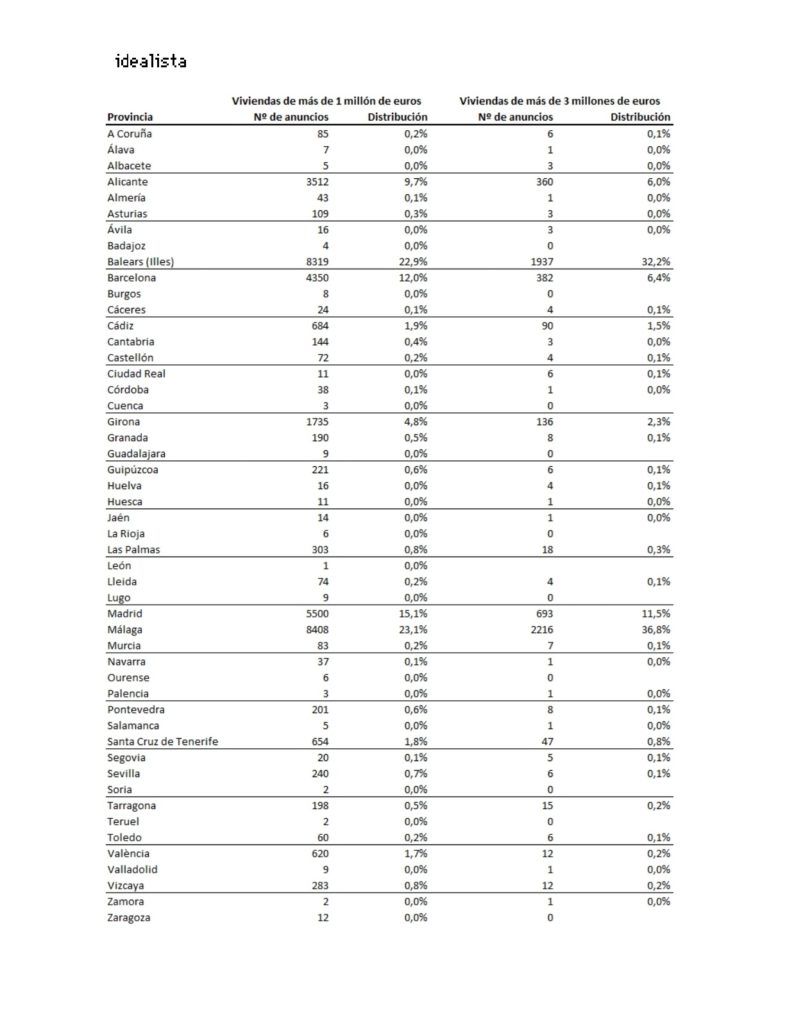 Existe, dentro del propio mundo de lujo, un terreno aún más exclusivo como es el de las viviendas de ultralujo, aquellas con un precio superior a los 3 millones de euros. Las más de 6.000 propiedades de este precio que había anunciadas a principios de agosto se concentran principalmente en Málaga (2.216 anuncios; el 36,8% del total) y Baleares (1.937 anuncios; 32,2%). Les siguen Madrid (693; 11,5%), Barcelona (382; 6,4%), Alicante (360; 6%) y Girona (136; 2,3%).