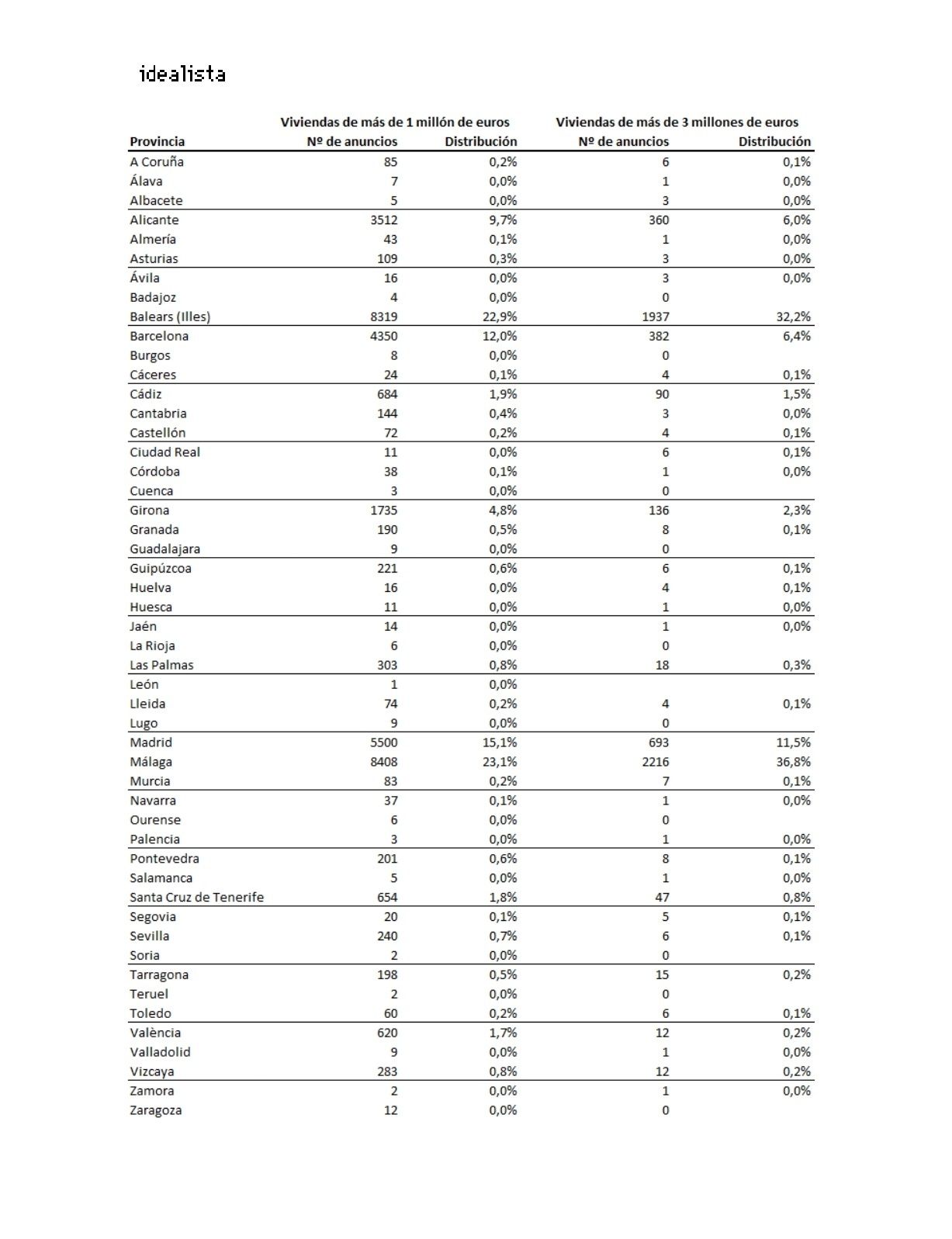 Cada una de las 50 provincias españolas tiene al menos una vivienda de más de un millón de euros anunciada en idealista, pero la distribución de las mismas no es homogénea. De hecho, las provincias de Málaga, Baleares, Madrid y Barcelona concentran el 73% de todas las viviendas disponibles por encima de esa cantidad. En muchas provincias, con menos de 20 viviendas anunciadas, su peso porcentual es insignificante, por lo que aparecen como 0,0%.