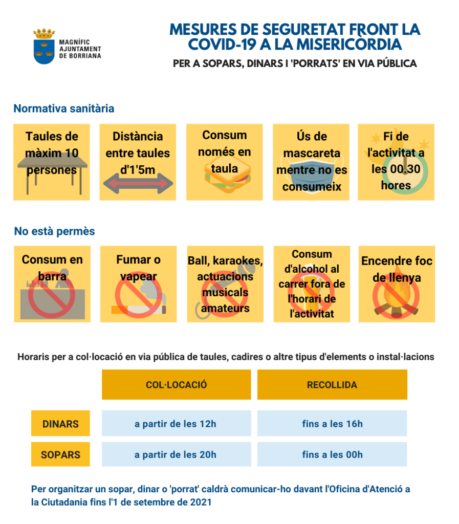 - Es permetran del 3 al 12 de setembre sopars, menjars i ‘porrats’ en via pública, en taules de fins a 10 persones, que hauran de ser comunicades prèviament, abans de l’1 de setembre de 2021 a l’Oficina d’Atenció a la Ciutadania