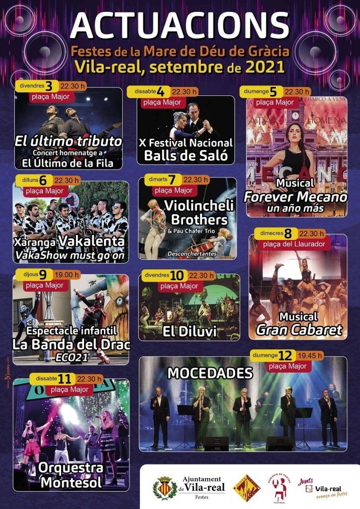 El programa de festes de la Mare de Déu de Gràcia comptarà amb una desena d’actuacions musicals que es desenvoluparan complint els protocols covid en recintes delimitats en la plaça Major i la plaça del Llaurador amb capacitat màxima per a 800 persones. El cartell inclou tributs als mítics grups El Último de la Fila i Mecano, les actuacions de El Diluvi i Mocedades, l’espectacle dels Violincheli Brothers i dels grups locals orquestra Montesol i xaranga Vakalenta. El musical Gran Cabaret, l’espectacle infantil de La Banda del Drac i el X Festival Nacional de Balls de Saló completen la proposta musical del programa de festes elaborat per l’Ajuntament de Vila -real, la Junta de Festes i la Comissió de Penyes.