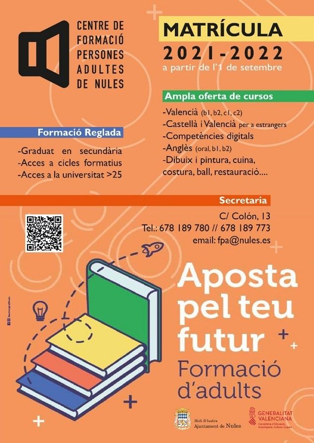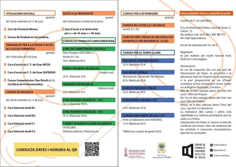 Amb tot, el període de matrícula d’alguns cursos encara està obert i les persones interessades es poden informar a la secretaria del Casal Jove, per telèfon cridant al 678 18 97 80 o 678 18 97 73 o escrivint un correu al mail fpa@nules.es