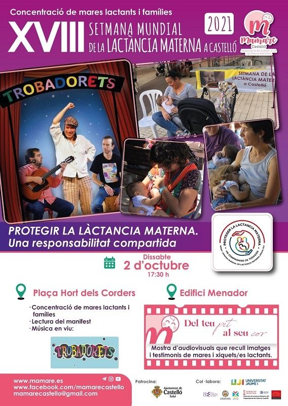 Després de la pausa obligada de l’any anterior, aquest 2021, MAMARE, associació per al suport a la lactància a Castelló, convoca de nou la seua trobada lúdica habitual de mares lactants i famílies per a celebrar la SETMANA MUNDIAL DE LA LACTÀNCIA, esdeveniment que el col·lectiu celebra per divuitena vegada.