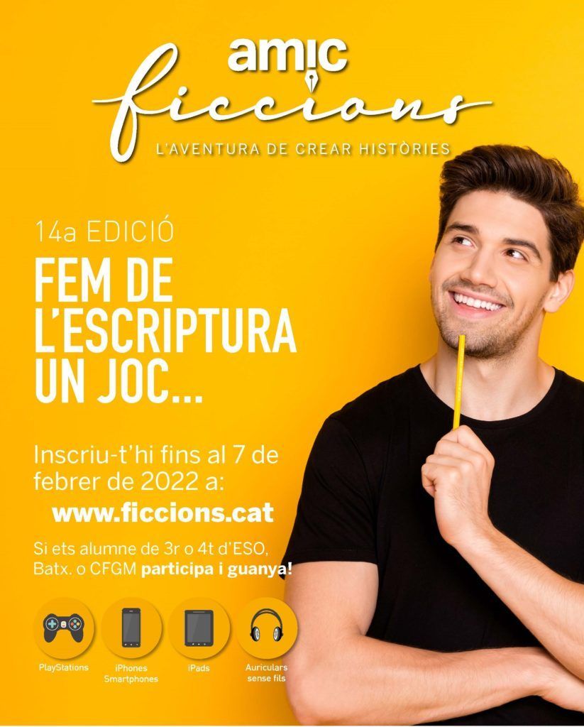 “AMIC-Ficcions, l’aventura de crear històries” és un concurs de creació literària per a joves que aquest curs arriba a la seva catorzena edició. L’any passat hi van participar més de 2.970 estudiants de segon cicle d’ESO, Batxillerat i CFGM de Catalunya, Illes Balears, País Valencià, Aragó i Catalunya Nord. Des del 4 d’octubre de 2021 i fins al 7 de febrer de 2022 els estudiants que vulguin participar es poden registrar a través del web www.ficcions.cat.
