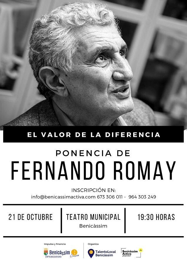 En aquest sentit, a través de Talento Local Benicàssim es programen ponències d’interessos comuns per a les empreses i emprenedors de Benicàssim i l’encarregat d’obrir el calendari aquest últim trimestre de l’any serà Fernando Romay, ex jugador de bàsquet, medalla de plata amb la selecció espanyola guanyada en els Jocs Olímpics de Los Ángeles 1984 i actualment presentador de televisió i conferenciant. Com explica la regidora responsable de l’àrea, Vanessa Batalla, “la seua innata simpatia i do de comunicació han fet de l’ex jugador de bàsquet un personatge mediàtic que compagina els seus quefers en els mitjans amb el foment dels valors de l’esport en les seues ponències”. Romay va ser diferent per la seua altura des de xiquet i va saber aprofitar-ho.