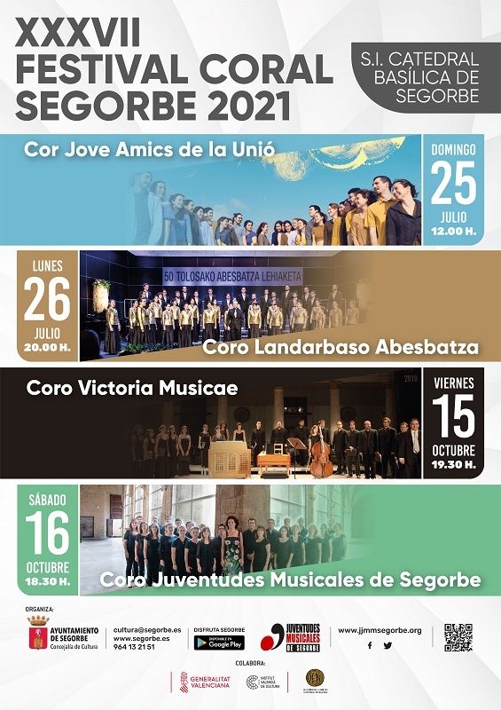 El XXXVII Festival Coral de Segorbe, uno de los festivales más reconocidos y un referente en la Comunidad Valenciana, celebra este viernes y sábado la segunda fase en la que actúan el coro Victoria Musicae y el Coro de Juventudes Musicales de Segorbe. Durante el festival se estrenará la obra vencedora en la edición de 2019, titulada Gloria in Excelsis Deo, de Esteve Palet Mir y también se dará a conocer el ganador del Concurso Internacional de Composición Coral Juan Bautista Comes 2021.
