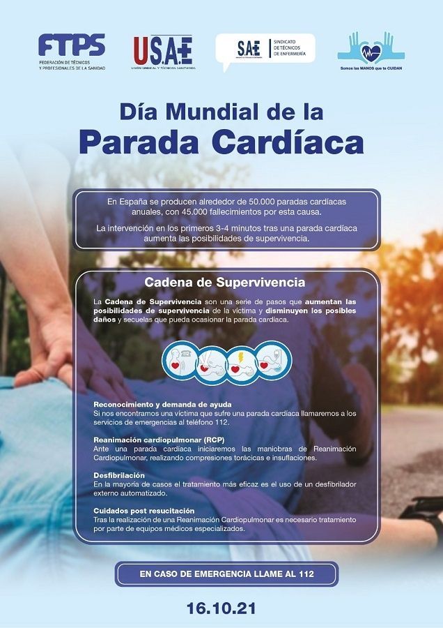 El Sindicato de Técnicos de Enfermería (SAE) se suma al Día Mundial de la Parada Cardiorrespiratoria con un cartel que quiere concienciar sobre este problema de salud por el que anualmente, según estima el Consejo Español de RCP, fallecen 45.000 personas en nuestro país, superando las muertes por accidentes de tráfico o diferentes tipos de cáncer.