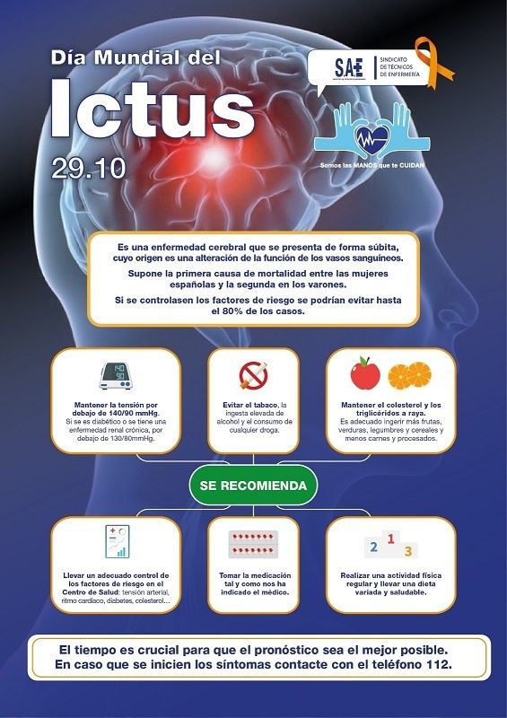 El Sindicato de Técnicos de Enfermería (SAE) ha elaborado un cartel informativo con una serie de pautas que pueden ayudar a prevenir la aparición del Ictus, patología que afecta a 120.000 personas cada año en España, siendo la primera causa de mortalidad entre las mujeres españolas y la segunda entre los varones.