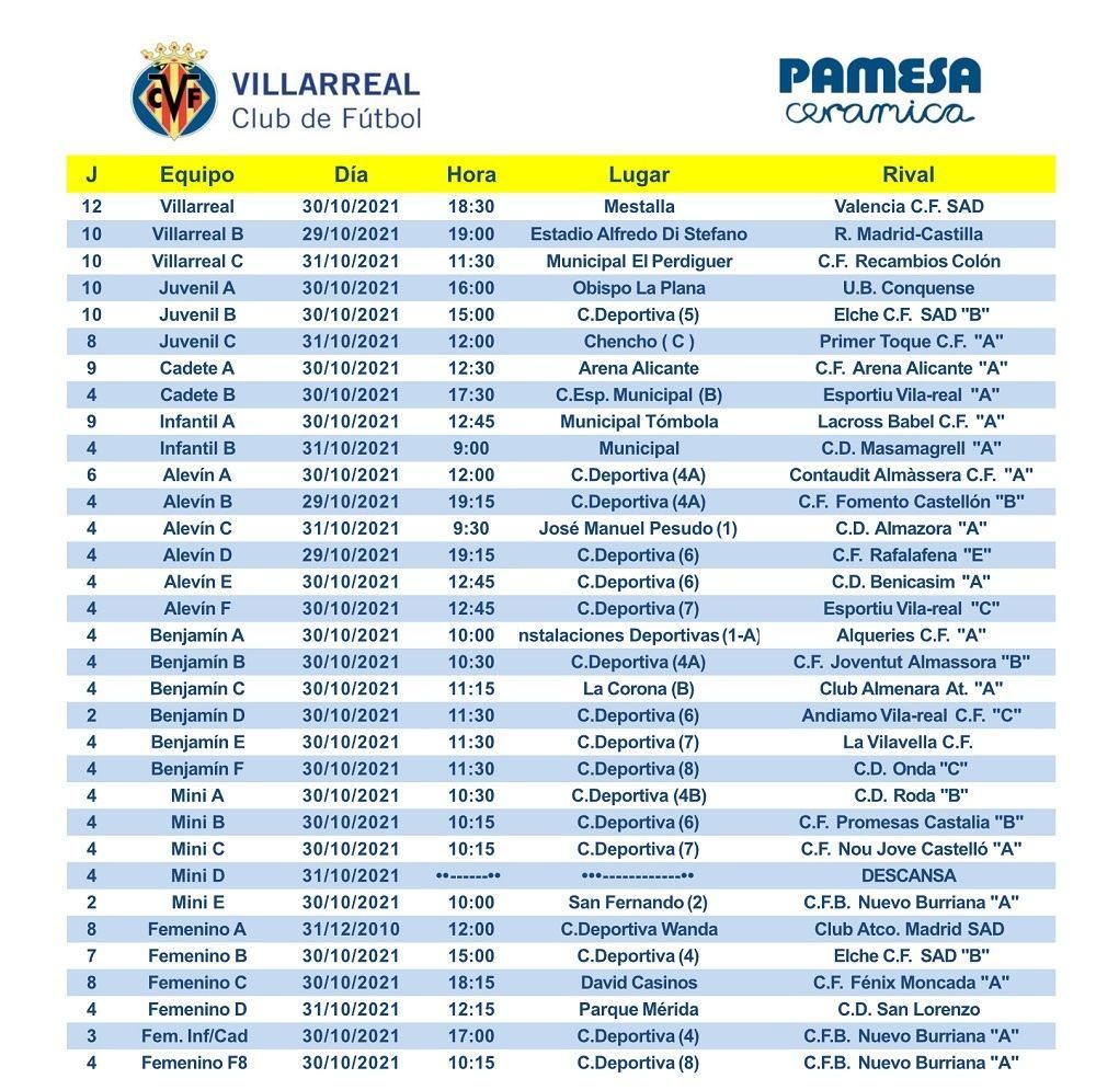 A continuación, puedes consultar todos los horarios de los partidos que jugarán los equipos del Villarreal CF este fin de semana: