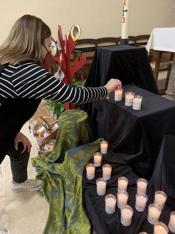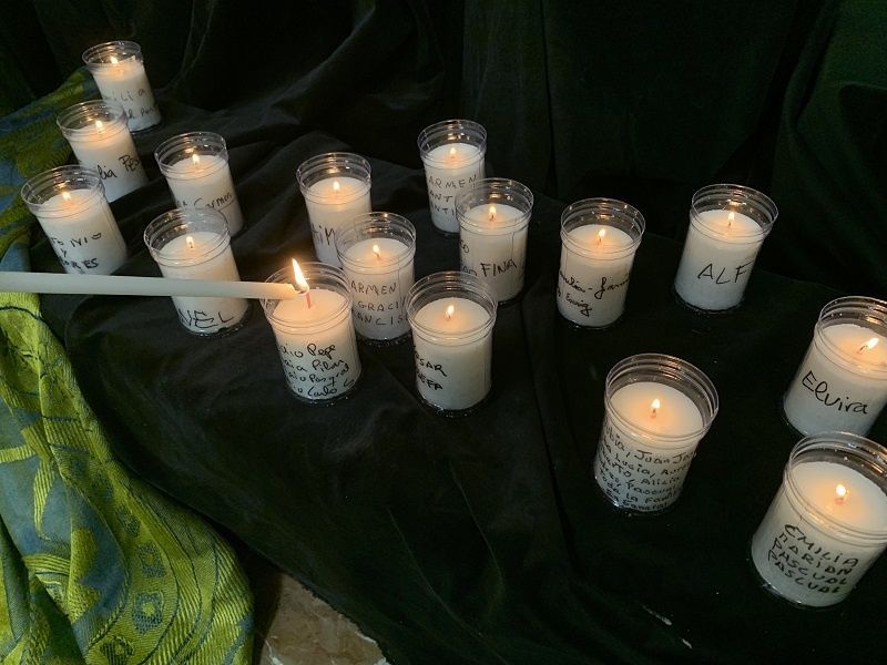 La celebración, oficiada por el Padre David , ha empezado con un pequeño gesto. Al entrar a la capilla, los asistentes han podido coger una vela y con un rotulador escribir en ella el nombre o los nombres de las personas que hoy querían tener presente. Y, una vez encendidas las velas, estás se han depositado delante del altar.