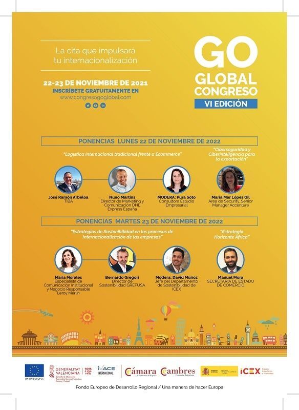 El Congrés, en el qual ja es poden inscriure les empreses de manera gratuïta en www.congresogoglobal.com , ultima els detalls d’aquesta edició que reprén el format presencial, i que també es podrà seguir en streaming. Se celebrarà els dies 22 i 23 de novembre de la mà de les Cambres de Comerç de la Comunitat Valenciana, l’Ivace Internacional i l’ICEX España Exportació i Inversions i finançat pel Fons Europeu de Desenvolupament Regional (FEDER).