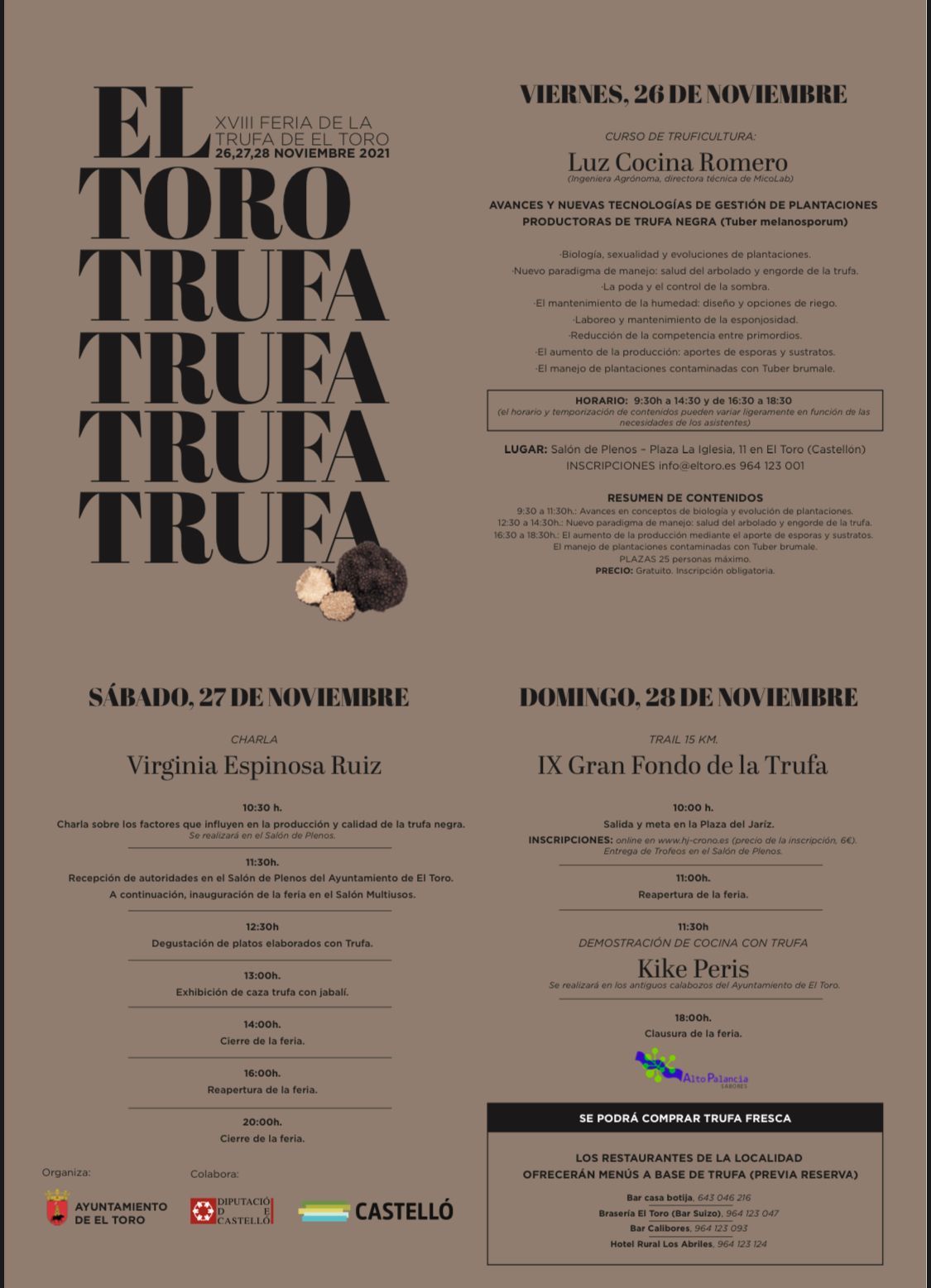 Para ello, El Toro prepara para el último fin de semana de este mes de noviembre una cita en la que no faltarán ingenieros, cocineros y técnicos de este sector que “arraiga en nuestras tierras y que saborean los paladares más exquisitos”. En efecto, las jornadas arrancarán el viernes 26 con un perfil más técnico y dirigido a formar, escuchar y debatir el trabajo en el campo para garantizar una buena cosecha y seguirá el sábado con una charla sobre la trufa negra y la apertura de una feria dedicada al hongo. La cita dominical abrirá con una competición deportiva y cerrará con una demostración de cocina que “está abierta a todos los públicos”.