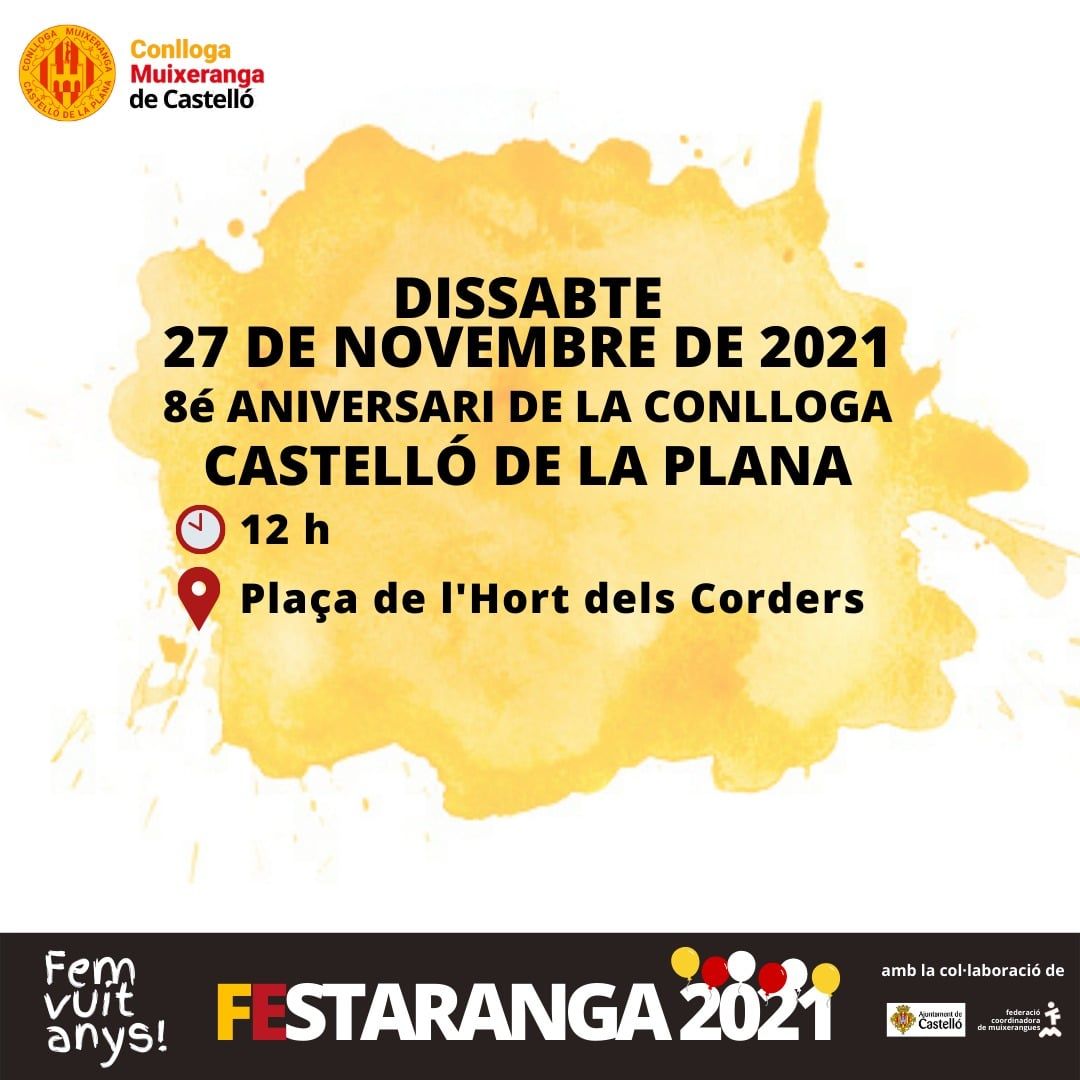 El dissabte 27 de novembre a les 12h la Conlloga Muixeranga de Castelló celebrarà el seus vuit anys amb una actuació a la plaça de l’Hort dels Corders. Aquesta actuació serà la primera que ofereix la Conlloga després de l’any i mig d’aturada obligada, i tots els seus membres tenen moltes ganes i il·lusió després d’haver pogut reiniciar els assajos amb l’objectiu de tornar a les places. Aquest any l’aniversari se celebrarà d’una manera especial, per les circumstàncies sanitaries actuals, no menys espectacular però amb totes les mesures de seguretat. Després de l’actuació la Conlloga continuarà la festa al seu Cau Muixeranguer amb un dinar de germanor, altres activitats lúdiques i el concert de Hit Parit.