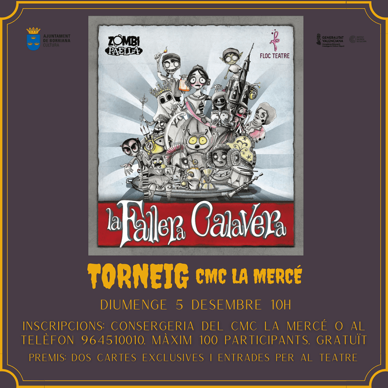 L’Ajuntament de Borriana ha obert el termini d’inscripció gratuïta per a participar en el torneig del joc de cartes La Fallera Calavera previst per a diumenge que ve, dia 5 de desembre, a les 10h al CMC la Mercè. La inscripció és limitada a cent participants per ordre d’arribada.